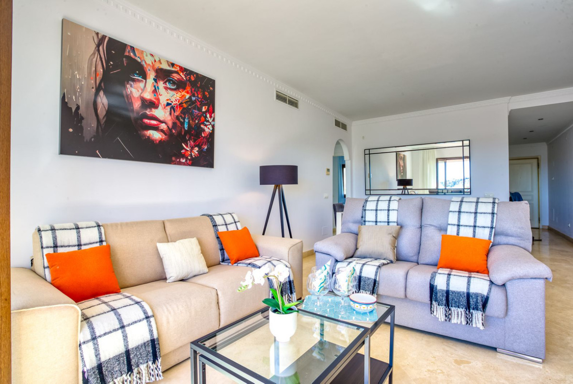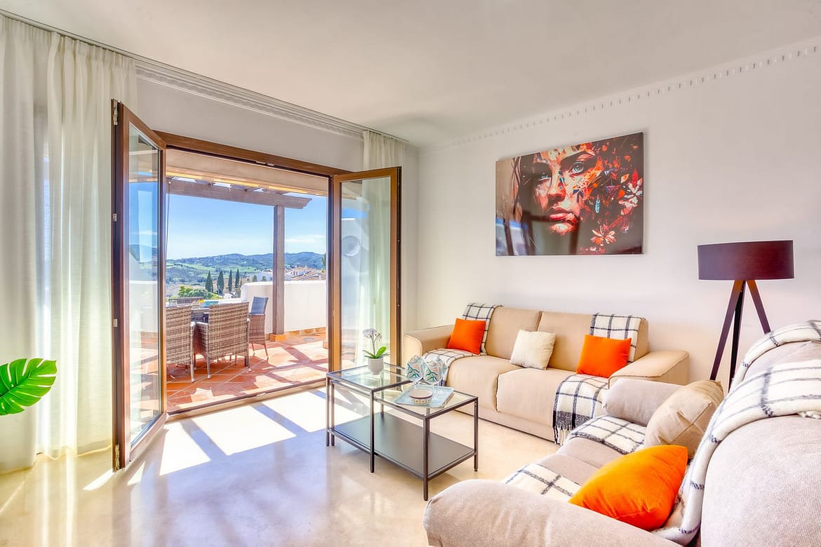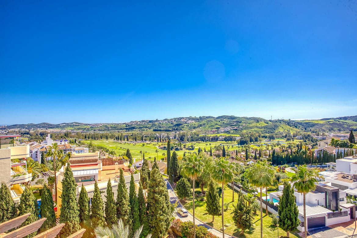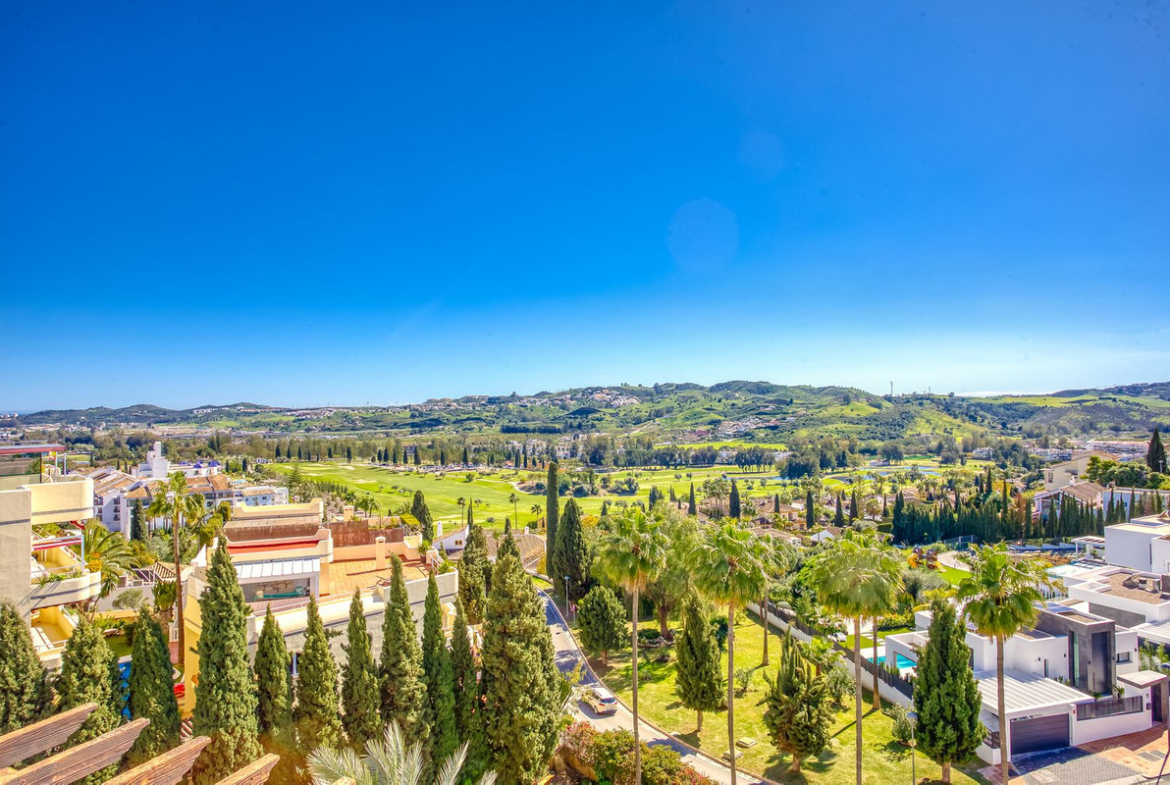 This south-facing penthouse boasts panoramic views over the lush fairways of Mijas Golf and the surrounding mountain range. Enjoy sun-drenched terraces and a peaceful setting, all within easy reach of local amenities.