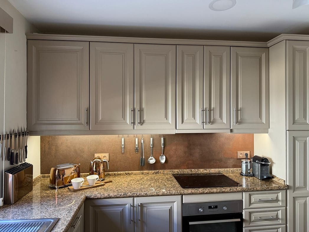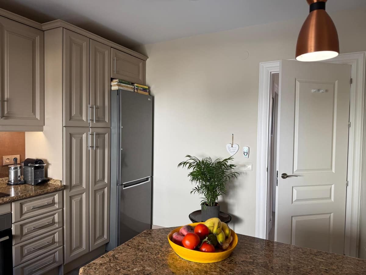 The fully fitted kitchen is equipped with high-quality appliances, including a fridge-freezer, integrated dishwasher, electric hob and oven, and a stainless-steel sink. Ample granite countertops and a practical breakfast bar make this kitchen as functional as it is stylish.