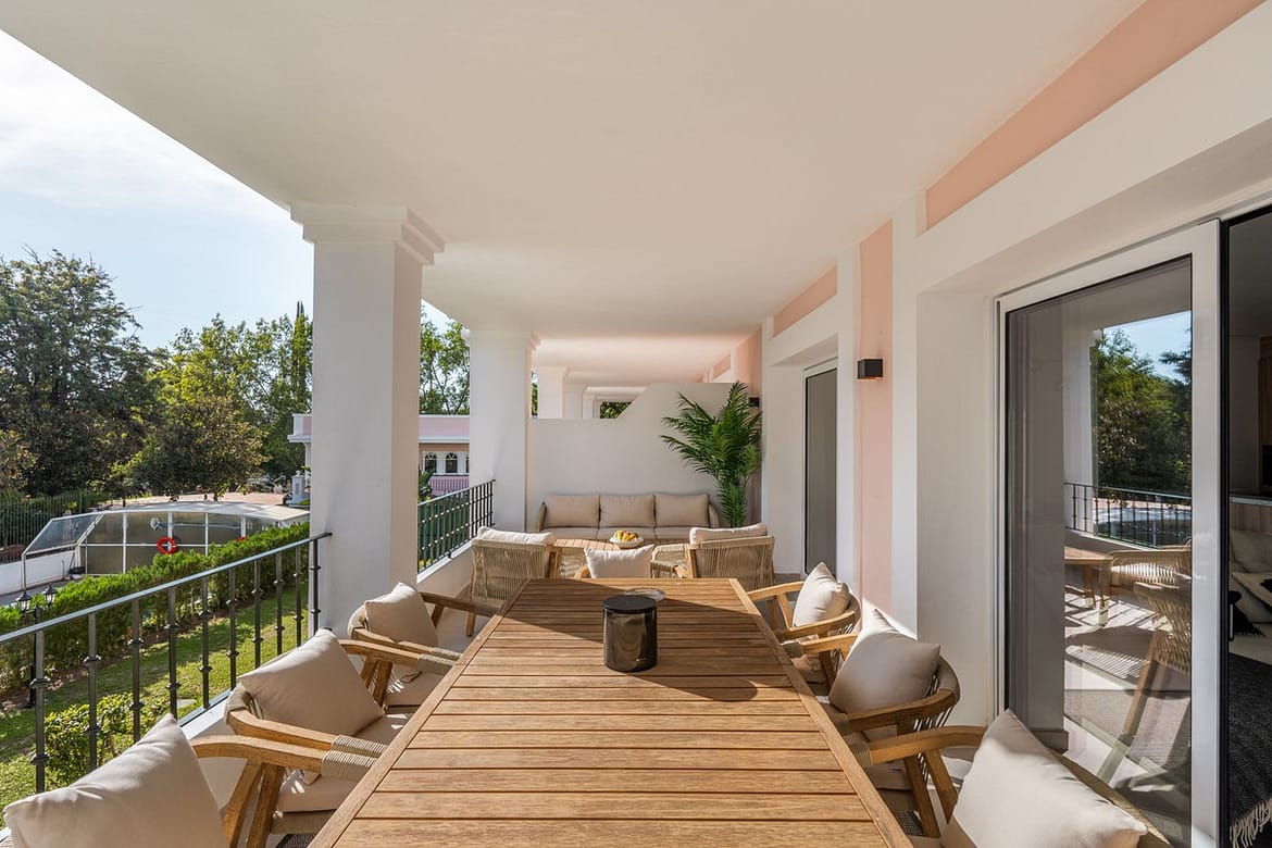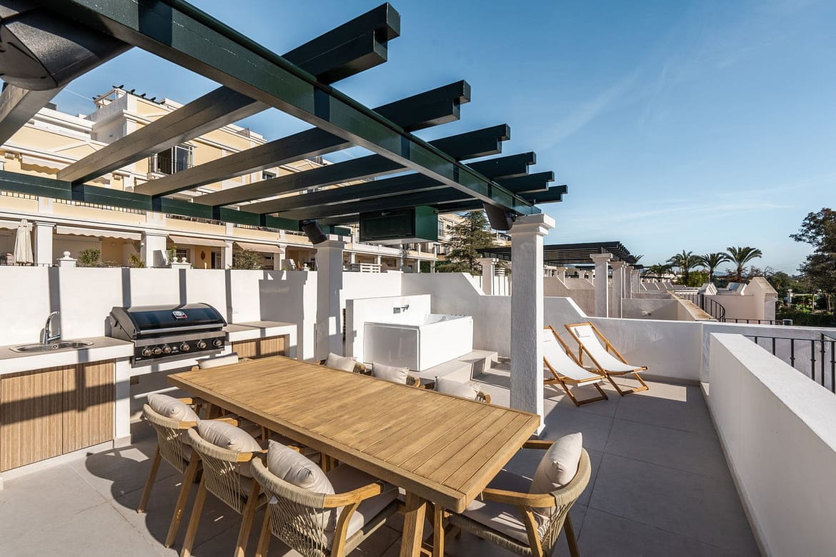 This is a refined duplex penthouse set within the gated community of Aloha Gardens in Nueva Andalucía. This property presents a well-balanced combination of modern design and a prime location in one of Marbella’s most established areas. The main floor is designed for harmonious indoor-outdoor living, featuring an open-plan living and dining space that flows onto a spacious terrace—ideal for relaxing or entertaining. A sleek kitchen layout and a guest toilet add convenience to this level. Upstairs, the night area offers three well-proportioned bedrooms. The primary suite enjoys a large wardrobe area, an en-suite bathroom, and direct access to a private terrace. From here, a staircase leads to the rooftop solarium, offering a quiet retreat with open-air potential. Two additional bedrooms share a well-appointed bathroom, ensuring both privacy and comfort for guests or family members. Located in the heart of Nueva Andalucía, it benefits from the amenities of Aloha Gardens, including three communal swimming pools. Just beyond the gates, residents enjoy proximity to some of Marbella’s best restaurants, boutique shops, tennis clubs, and golf courses. This is an exceptional opportunity to acquire a fully renovated penthouse in a highly regarded residential enclave.