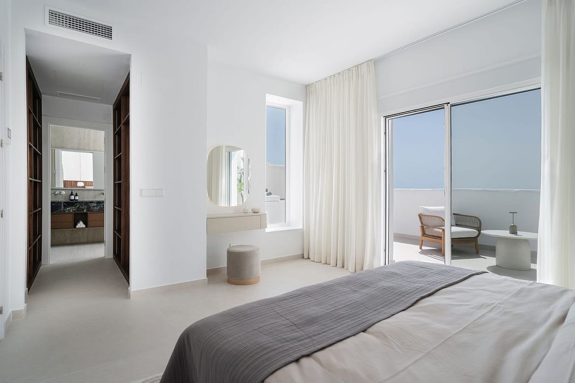 Upstairs, two more en-suite bedrooms each enjoy their own terrace. The master suite offers a walk-in closet and a spacious terrace complete with a private plunge pool, outdoor shower, and uninterrupted sea views, a true retreat.