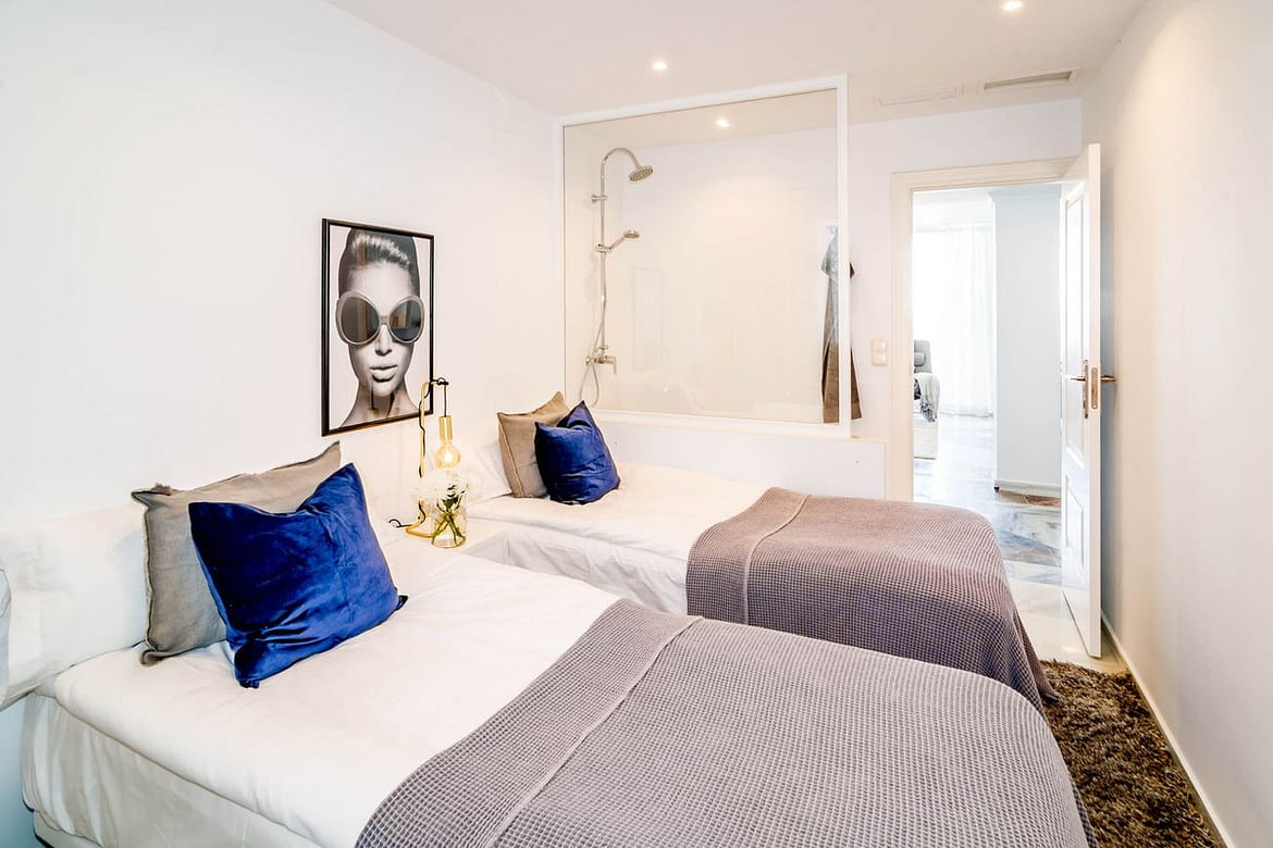 A duplex penthouse it has 3 bedrooms, 1 of which is on the entrance floor together with an en-suite shower. There is also a guest toilet on the same floor.