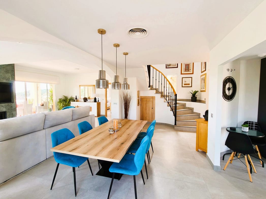 The bright and generous living room enjoys spectacular sea views and includes a dining area, a cosy wood-burning fireplace and a stylish bar corner. The fully equipped kitchen with Bosch appliances connects to a charming terrace, ideal for enjoying breakfast outdoors. There is also a separate utility room with appliances. The main terrace, together with the private ones, offers different ambiences to relax and take in the views.