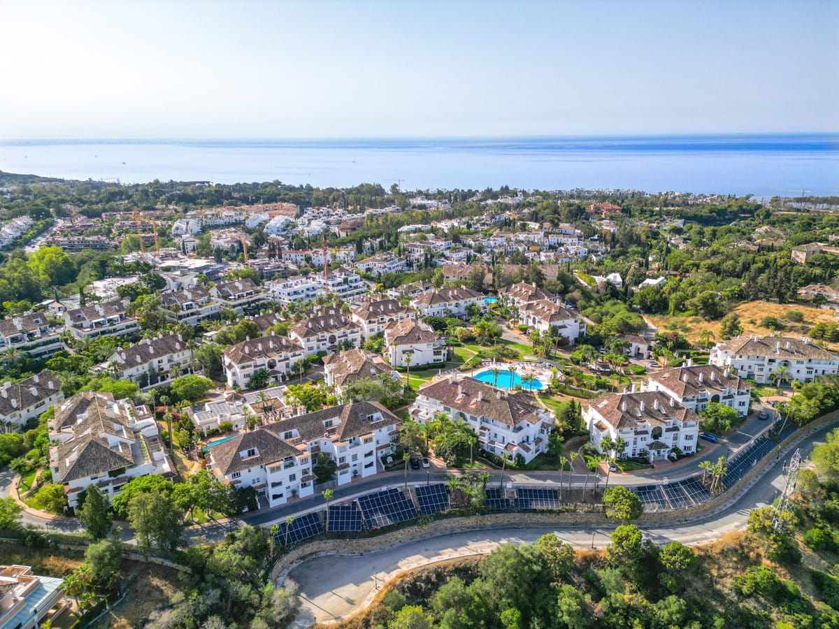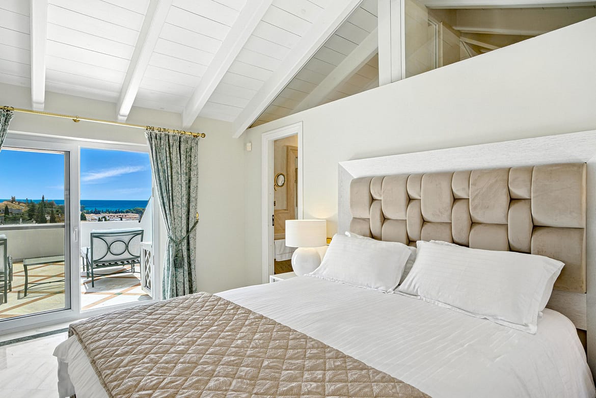 Wonderful three bedroom, south east facing duplex penthouse in the exclusive and gated community of Monte Paraiso on the Golden Mile, with 24hr security, several outdoor swimming pools, a bar/restaurant, children’s play area, fully equipped gym, steam room, sauna, squash court, massage room, indoor heated swimming pool and tropical gardens that are maintained to the highest standards. As well as all this it is only a short walk to the famous Puente Romano Hotel and the beach. The main level of the property has a large living and dining area with patio doors leading out to the spacious terrace with amazing sea views; a fully fitted kitchen with separate utility room; two guest bedrooms, one with a private terrace with stunning views to La Concha mountain; and a guest bathroom. The upper level leads to the master suite with vaulted ceilings, a Jacuzzi bath and access to a private terrace with spectacular sea views. Other features include marble floors, fireplace, fitted wardrobes, hot and cold air conditioning, two private parking spaces and a storage room.