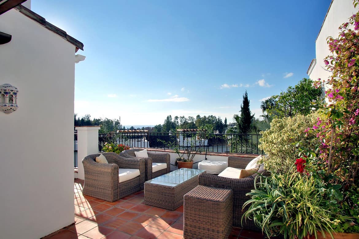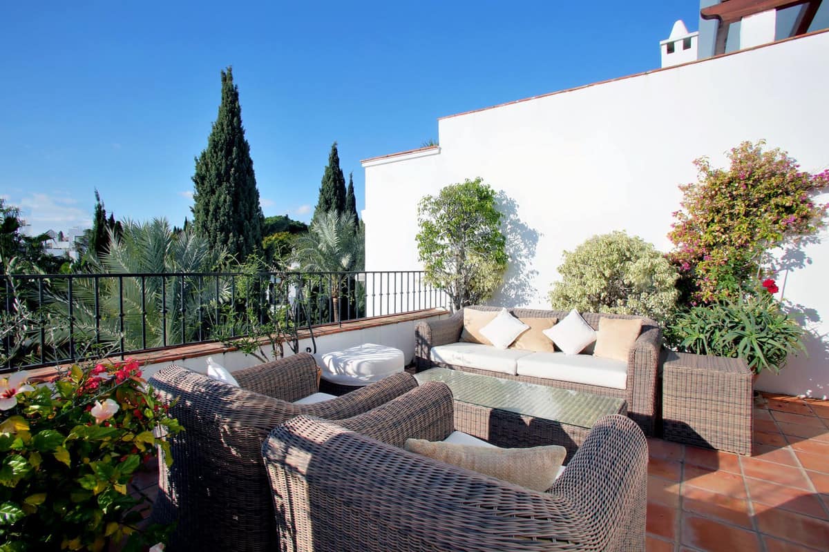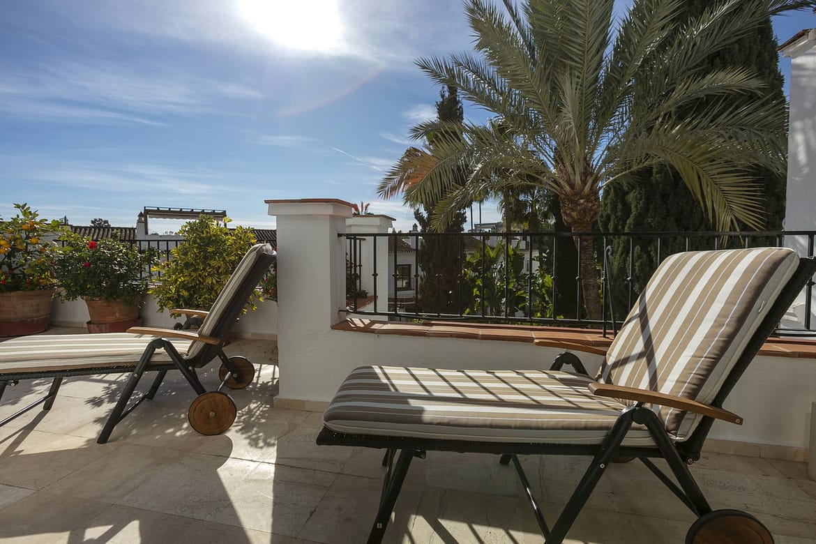 Superb three bedroom penthouse in the exceptional gated community of Señorio de Marbella, built in the Andalusian pueblo style and set in the heart of Marbella’s fabulous Golden Mile. Guests will enjoy expansive landscaped tropical gardens, waterfalls, fountains and flower gardens, five swimming pools (one heated in the colder months), a fully functioning restaurant (open from Easter until mid September) , two tennis and two paddle courts. This gated community has manned security with a guard on duty 24/7.