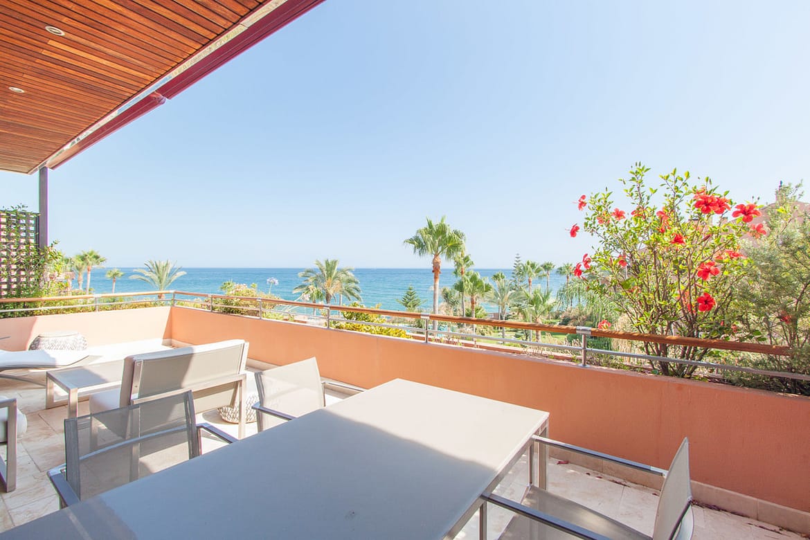 Stunning beachfront three-bedroom duplex penthouse fews minutes away from Puerto Banus. fully-equipped Gaggenau kitchen with a large living and dining room opening onto an extensive outdoor terrace. Master bedroom boasts high vaulted ceilings along with a large terrace with outdoor shower with sea view. Malibu is an exclusive community boasts 24-hr guard gated security, two swimming pools, gym, sauna and Turkish bath. Two-assigned underground parking spaces.