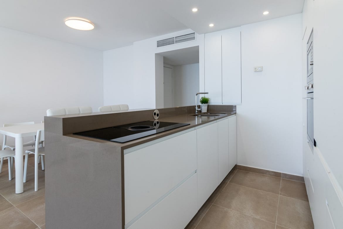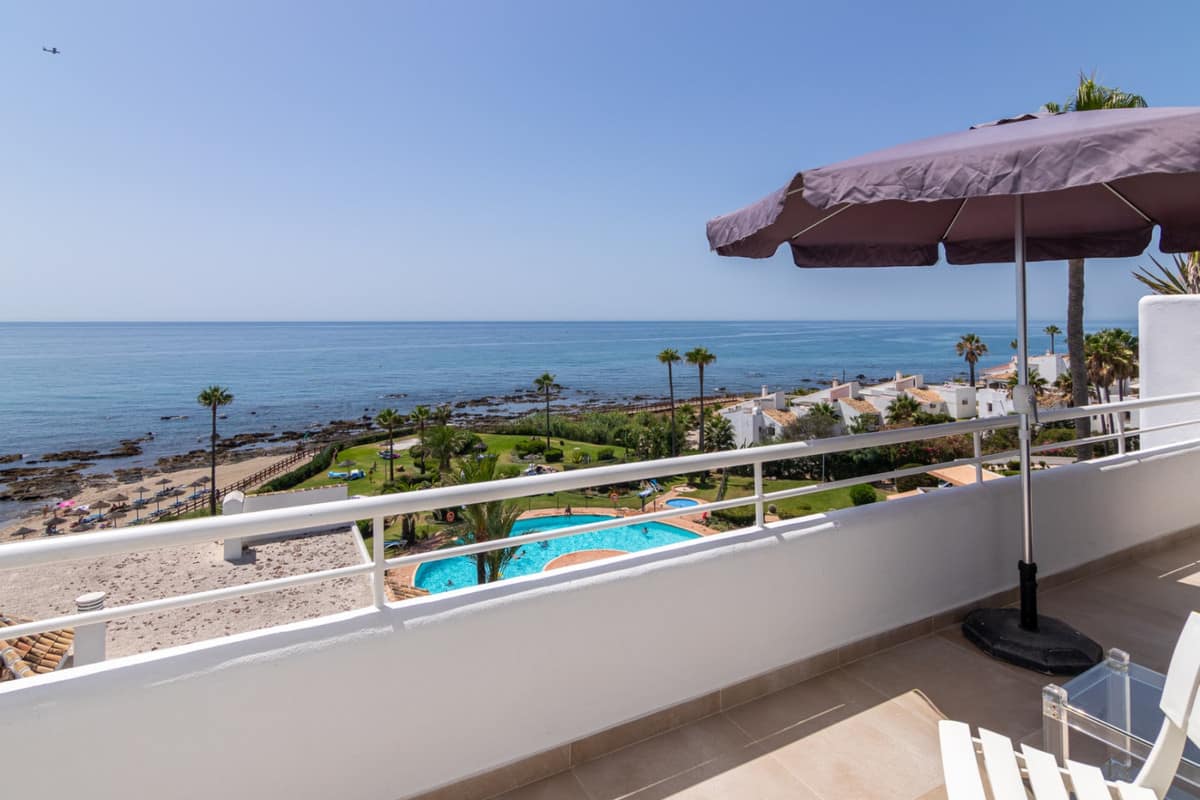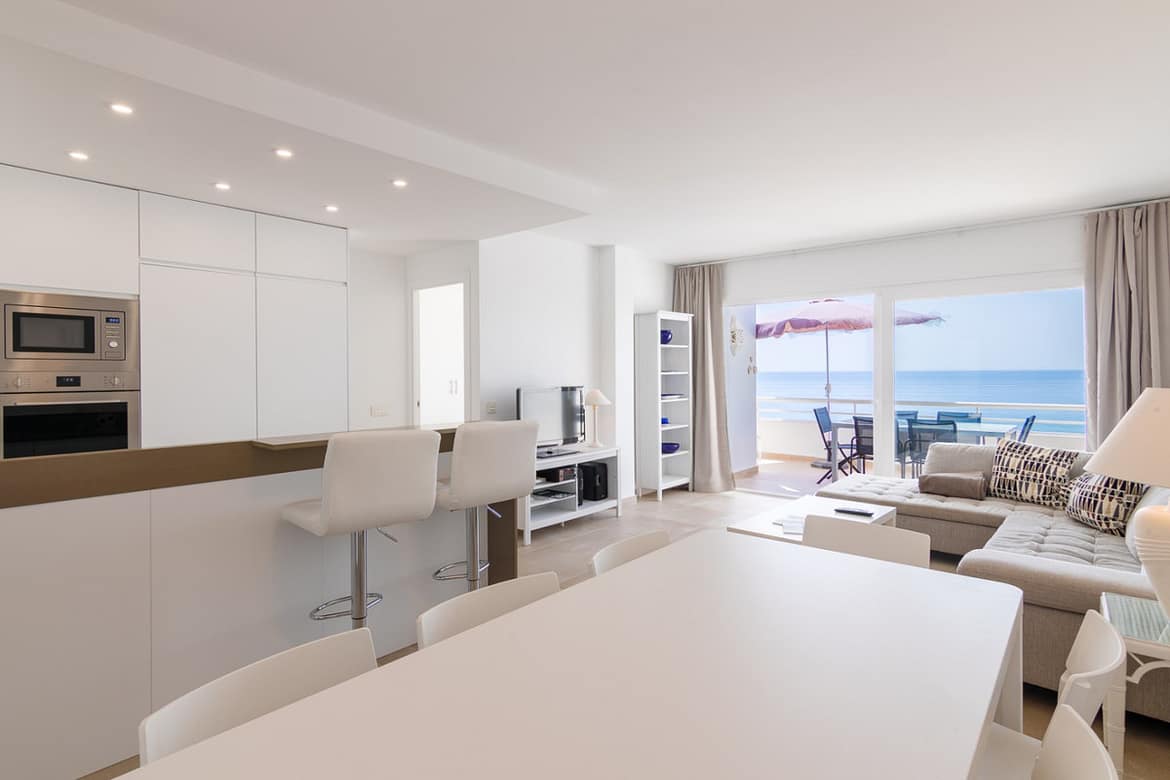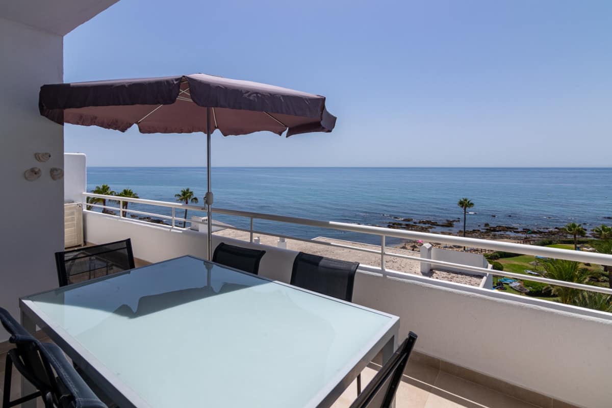 This apartment complex is located directly on the beach and has a large swimming pool with tropical gardens. The apartment is located on the top floor and has a beautiful terrace with a panoramic view over the sea, beach, promenade and swimming pool.