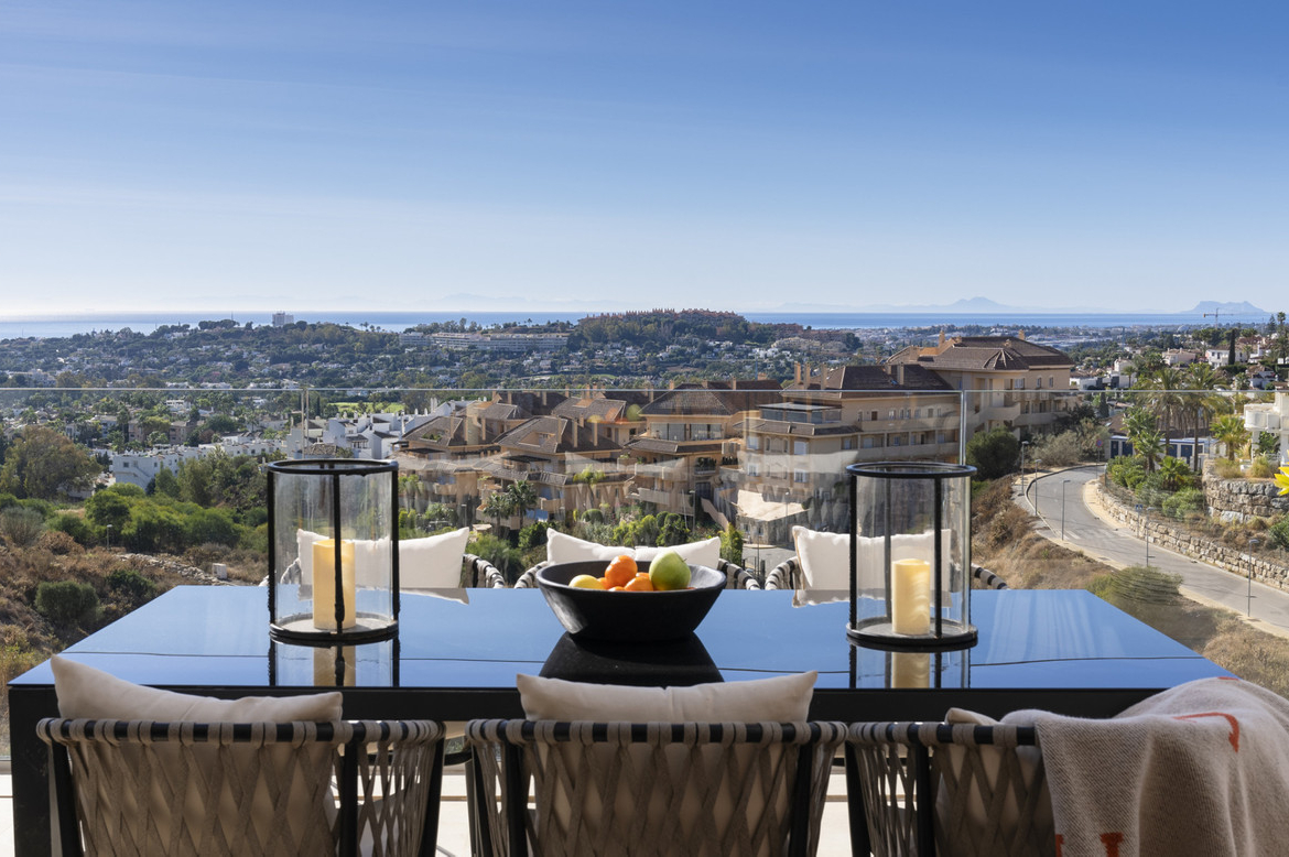 This spacious duplex penthouse is located in the highest part of Nueva Andalucia offering stunning views. With a private heated pool, a built area of 155m2 and an additional terrace space of 144m2, this property offers a spacious and comfortable living experience.