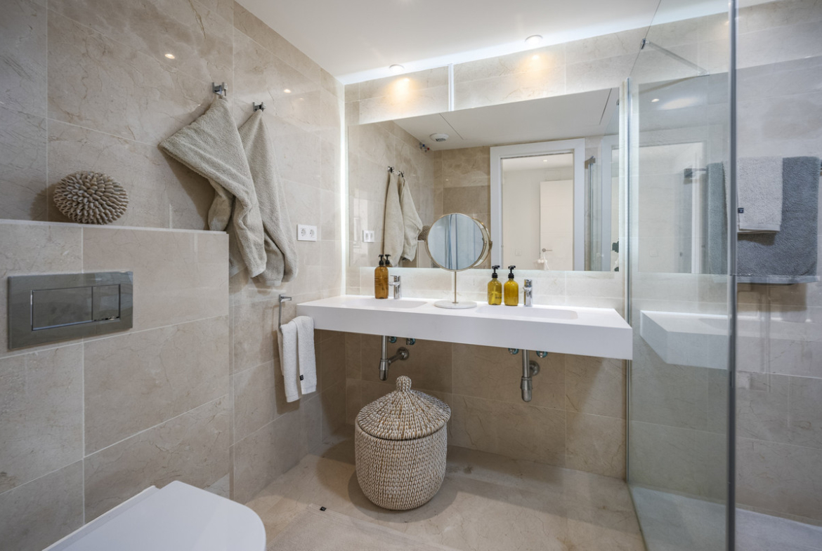 The interior of this penthouse is designed in a modern and Scandinavian style, with high-quality materials used throughout and the fully fitted kitchen is equipped with Siemens appliances. One of the highlights of this property is the outdoor space. The large south-facing terrace is ideal for al fresco dining, with a fully equipped outdoor kitchen and barbecue. The terrace also features a private 3×6 meter heated pool, perfect for relaxing and enjoying the Mediterranean climate.