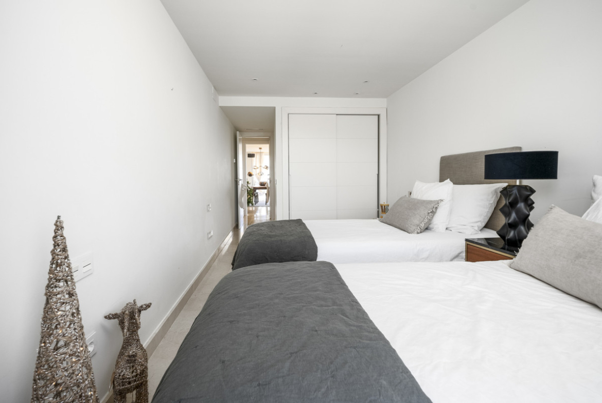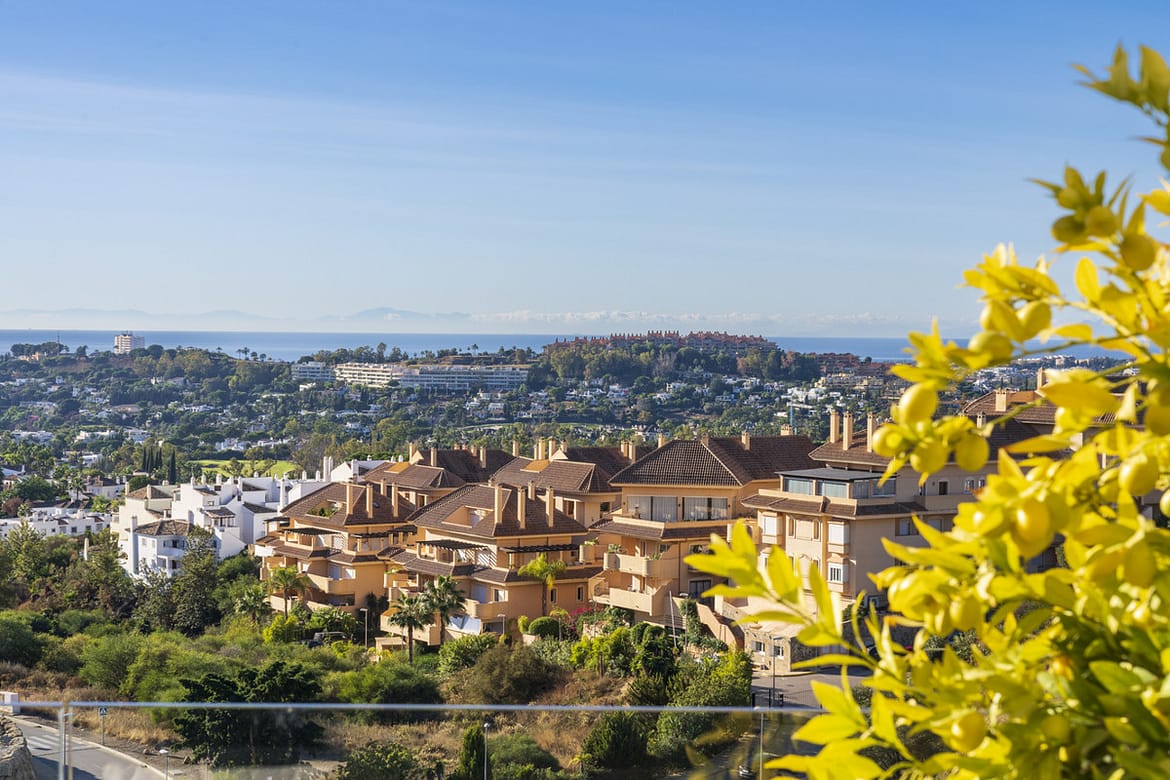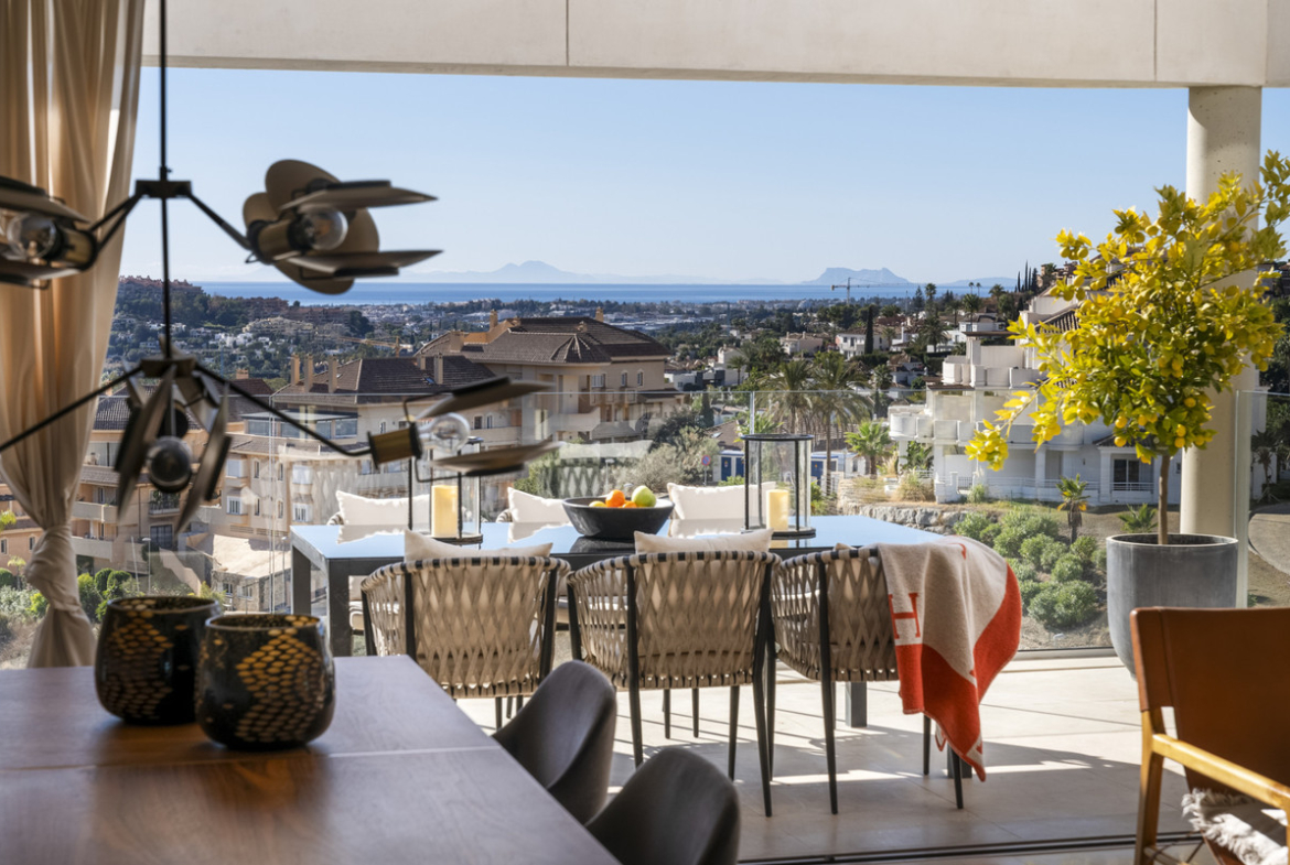 This spacious duplex penthouse is located in the highest part of Nueva Andalucia offering stunning views. With a private heated pool, a built area of 155m2 and an additional terrace space of 144m2, this property offers a spacious and comfortable living experience.