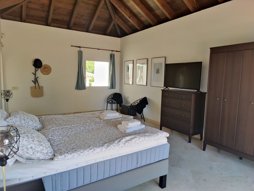The property has been furnished to a high standard and comprises: large living room with access to a south-west facing terrace overlooking the garden, the pool and the sea; fully equipped kitchen and separate laundry area; two main floor bedrooms with 2 single beds, one with en-suite bathroom, the other one with a separate bathroom; upstairs Master bedroom with bathroom and dressing en suite and access to large terraces with barbecue and sunbathing area, offering privileged views.