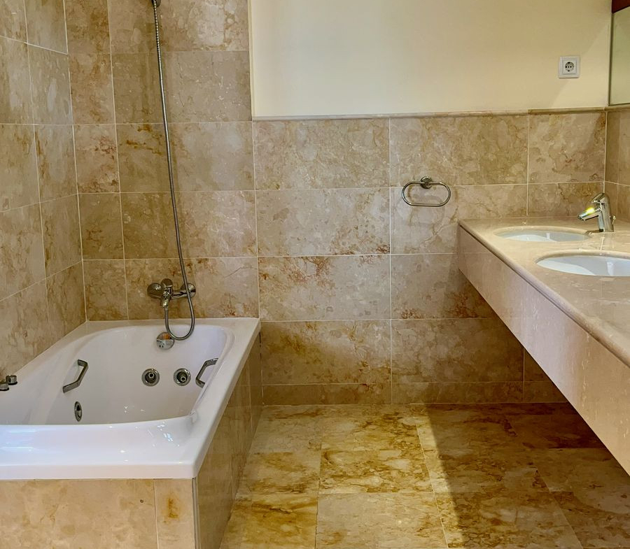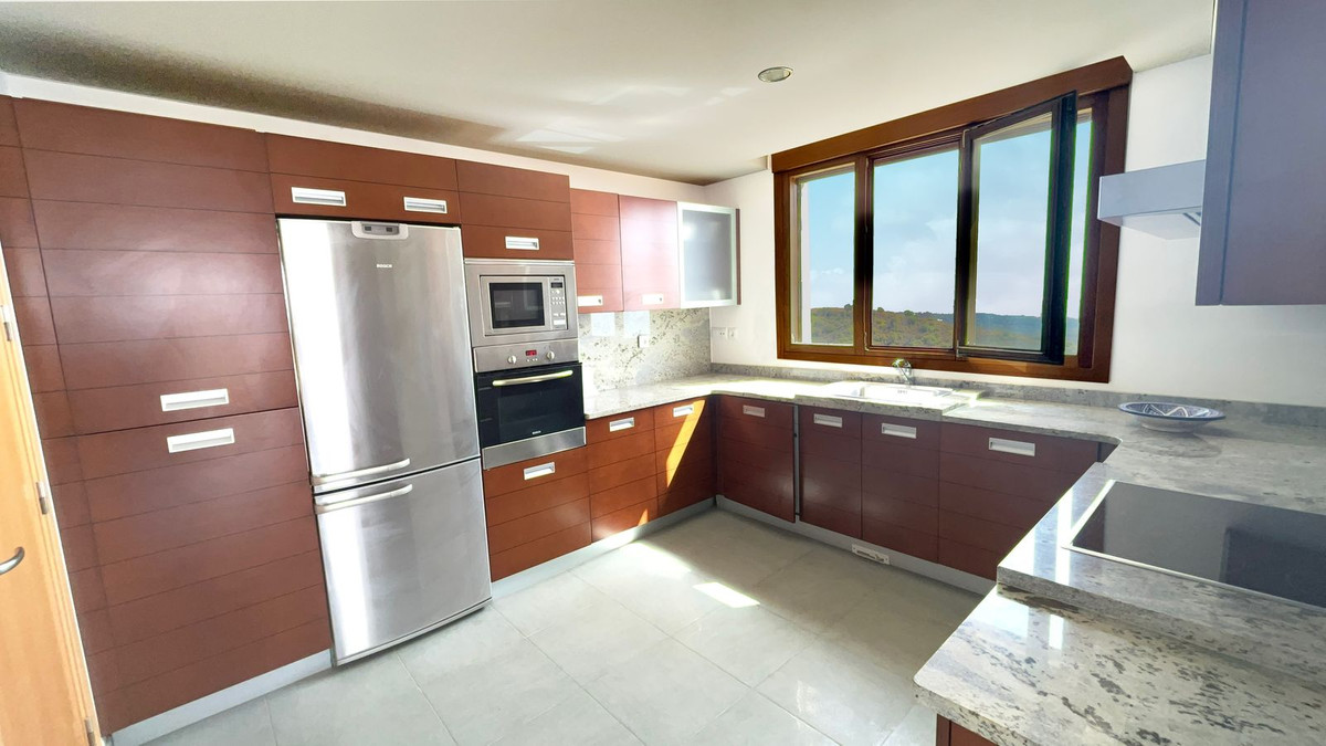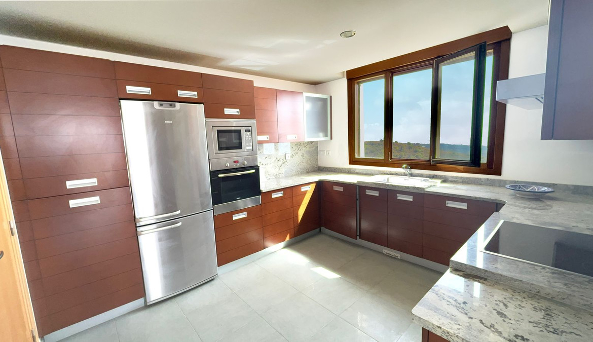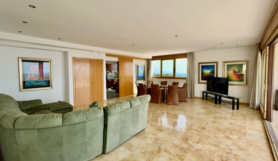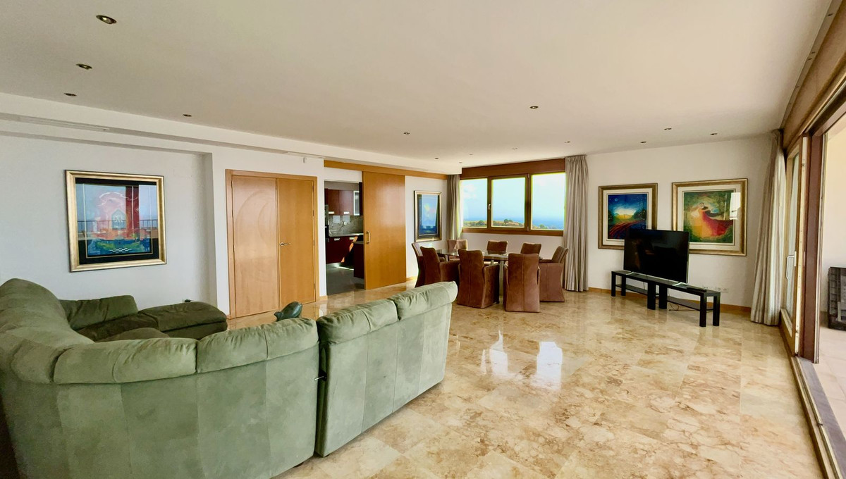 The apartment has a large entrance hall with a built-in wardrobe, to the right you have a large living room with a dining area, a storeroom/storage room and a view of the large terrace with incredible views. From the living room you also have access to both the integrated kitchen with a large window over the sink with a lovely view and the entrance again. To the left of the entrance is a long hallway with two bedrooms and two bathrooms on each side and at the end is the master bedroom with en-suite bathroom and walk-in closet and access to another terrace.