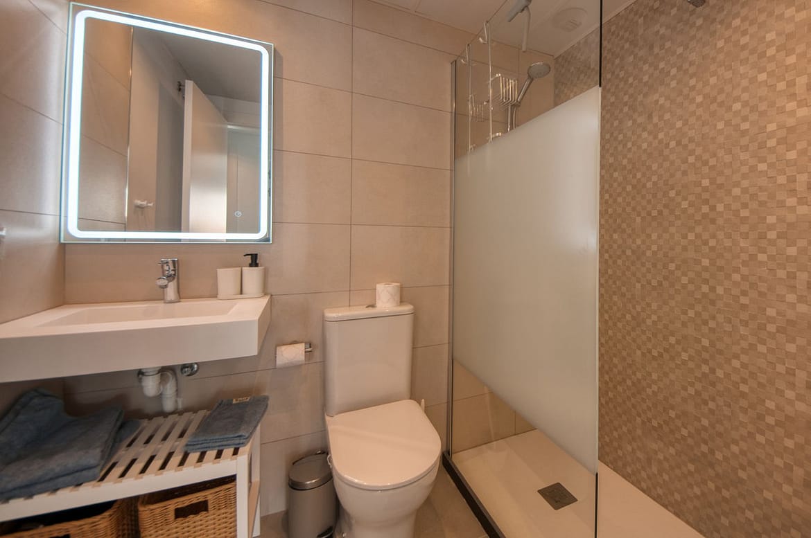 A sliding door separates the living area from the sleeping quarters, which include three double bedrooms with built-in wardrobes and electric blinds. The master bedroom has an en-suite bathroom and terrace access, while the other two bedrooms share a bathroom.