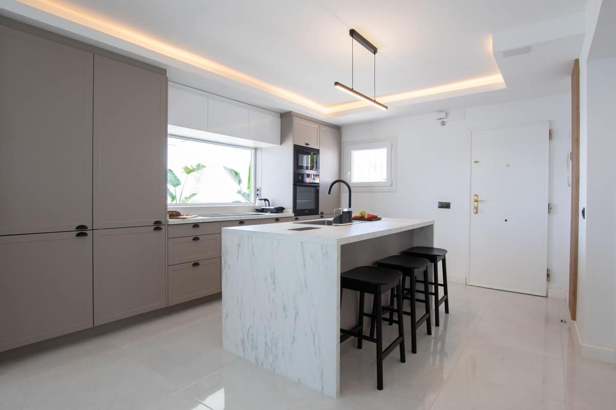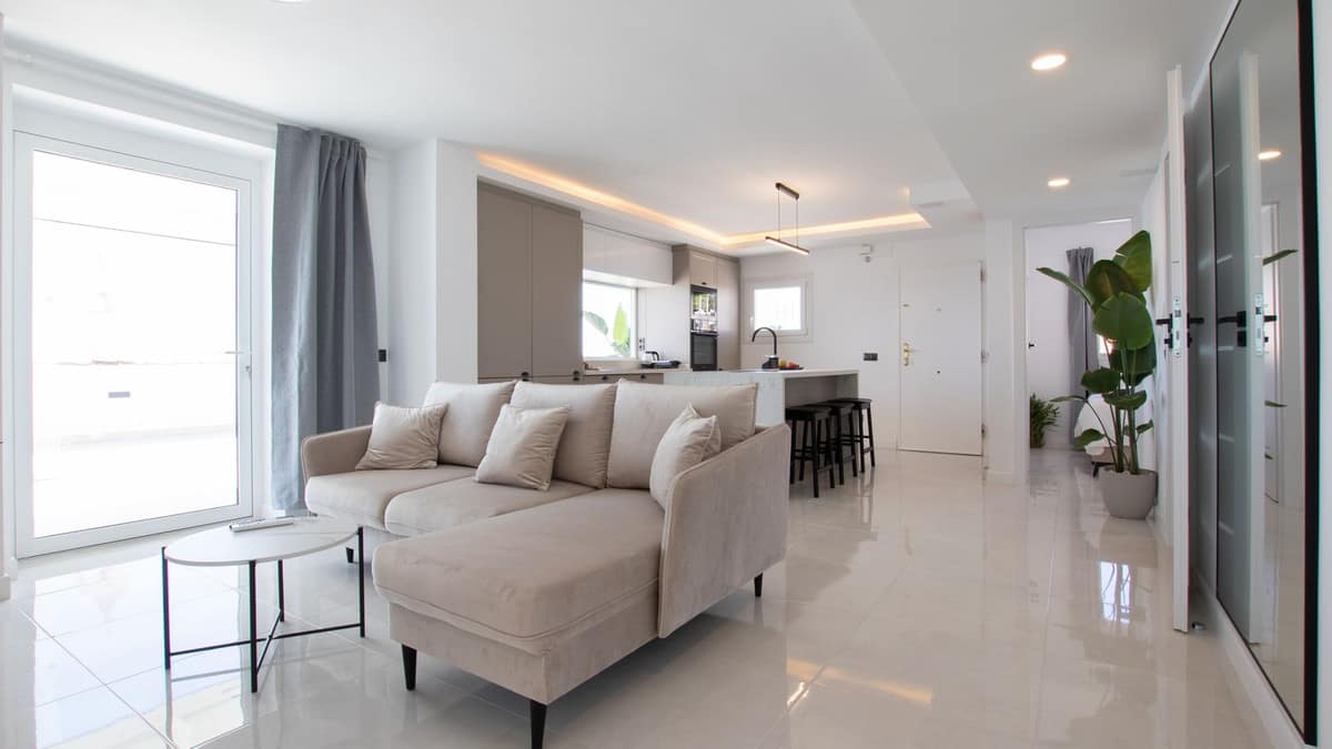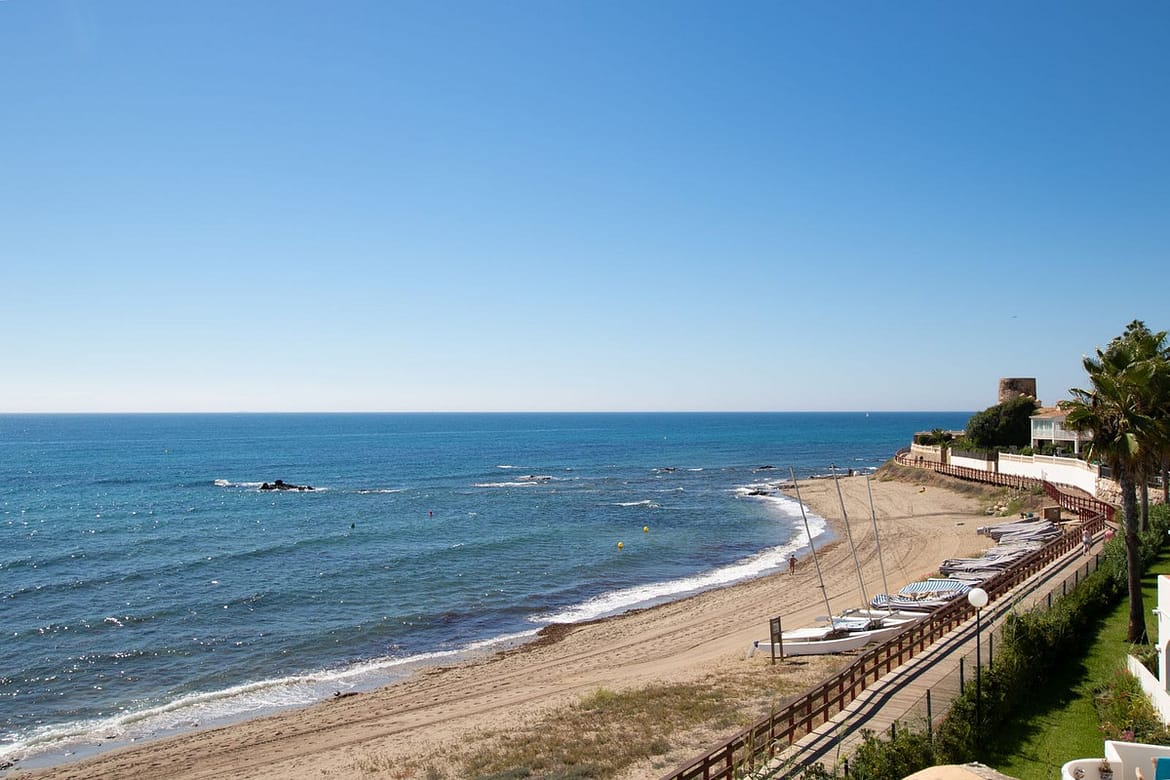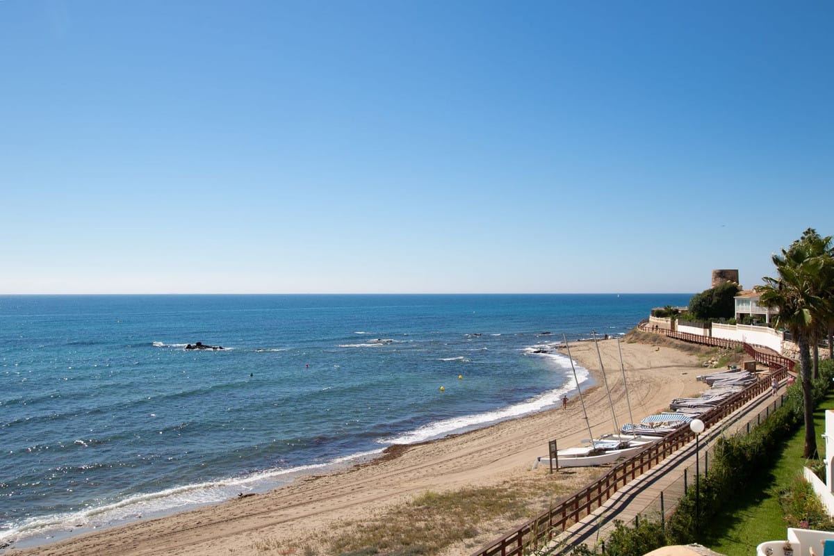 The apartment is a corner penthouse on the beachfront in Calahonda, Mijas Costa, province of Málaga. Completely renovated, without leaving a single detail to chance, the apartment has a large open kitchen, more than 4 meters long and with a large island. All appliances are new, there is a washing machine, dryer, dishwasher, refrigerator, induction hob, microwave, toaster, blender, coffee maker, etc. Fully stocked with a large selection of plates, bowls, glasses, mugs, etc. The kitchen has a lot of light since it has 2 windows, both with views of the sea and the beach. The living room is large and square, with an L-shaped sofa bed, smart TV, sea views from many angles and a door leading to the private terrace. On the terrace of more than 60 m2 there is a covered part, with a large table and 6 chairs, hot and cold air conditioning (split), and the other part of the terrace is without a roof, with a barbecue, sun loungers. and beautiful views of the sea, facing east, south and west.