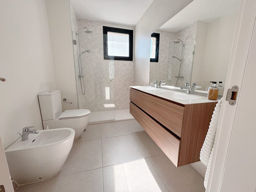 The spacious interior features a bright open-plan living and dining area, a modern fully equipped kitchen, and direct access to a large private terrace—perfect for enjoying the peaceful surroundings and breathtaking views. The master bedroom includes en-suite bathroom with walk-in shower. Two additional generous bedrooms with built-in wardrobes, a stylish bathroom with double sinks and walk-in shower, and a laundry area complete the layout.