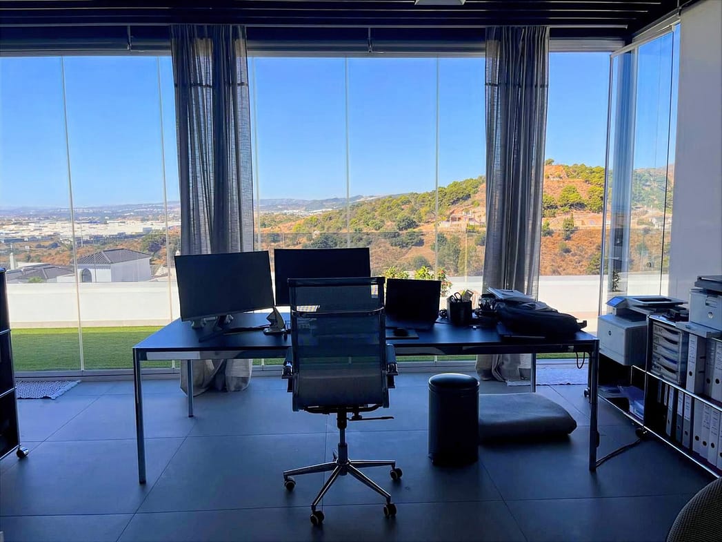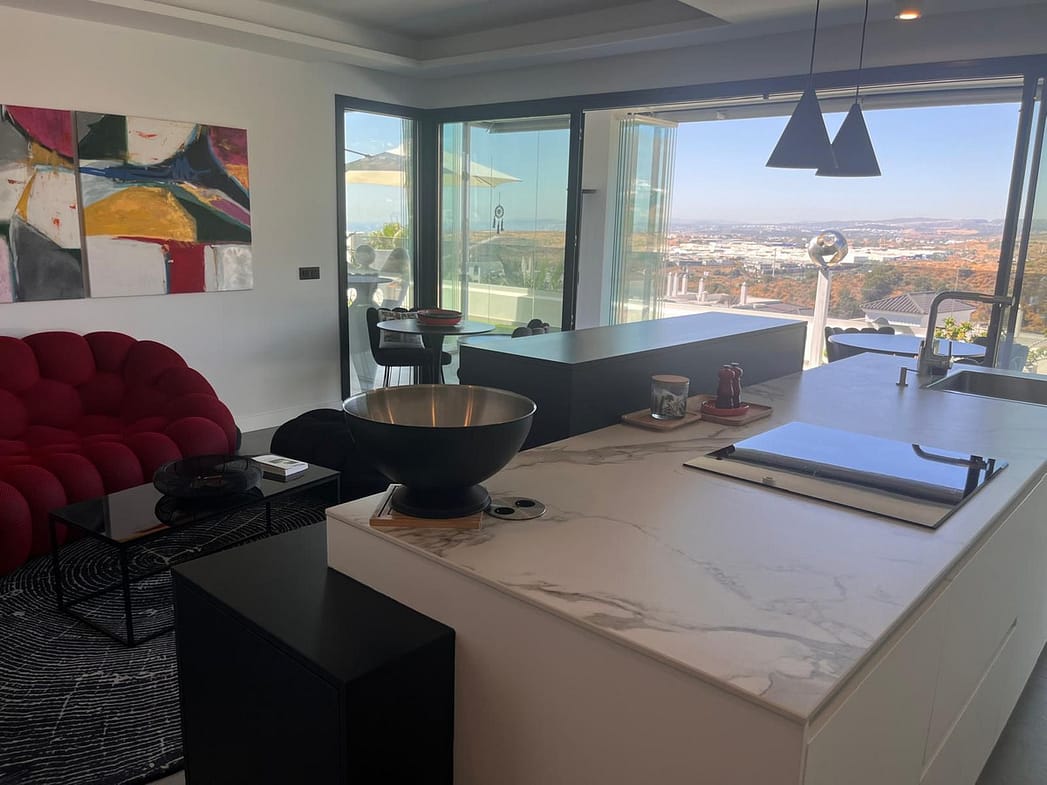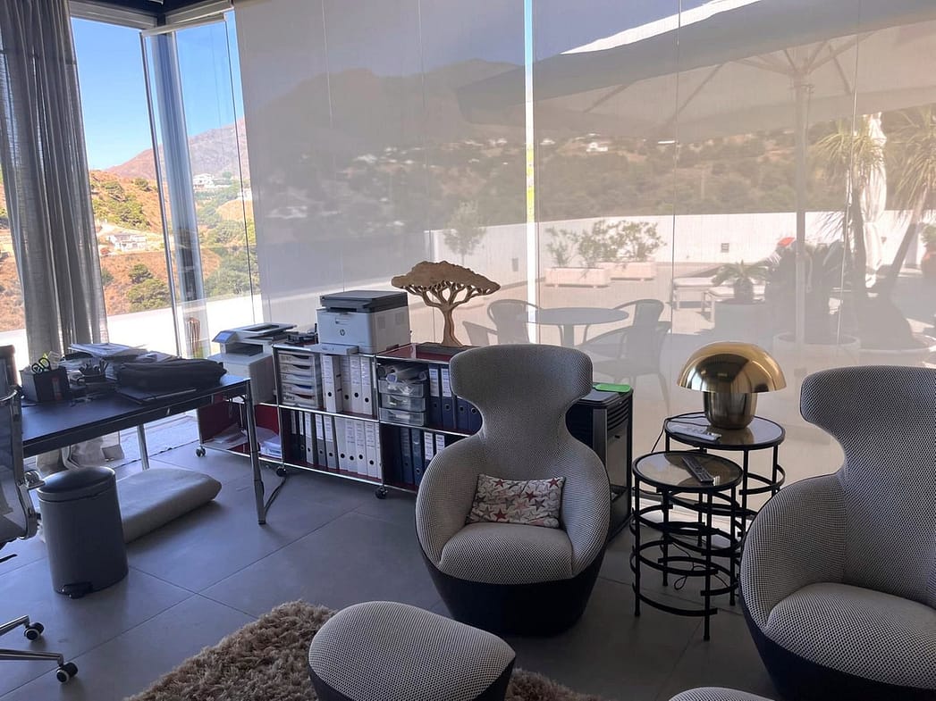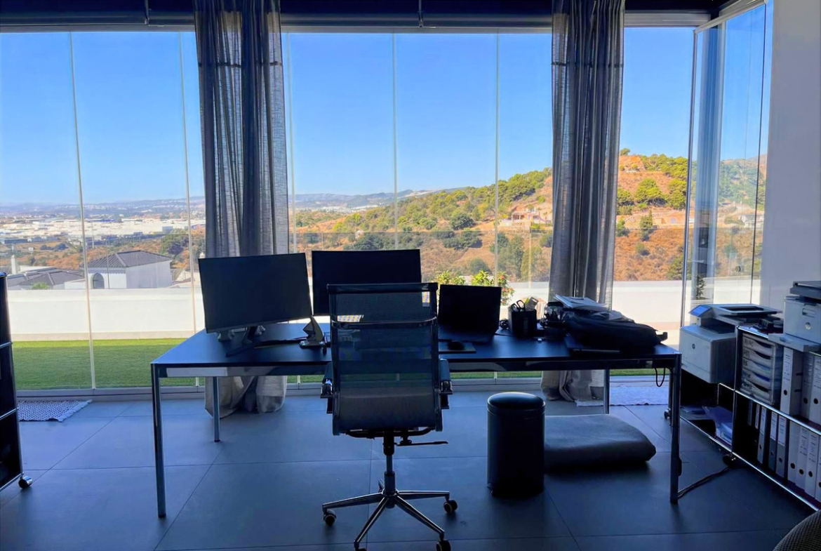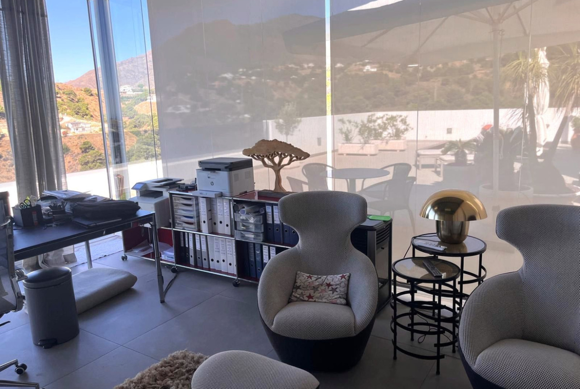 From the kitchen, you step into a large office space that flows seamlessly onto a private terrace, perfect for installing a jacuzzi or plunge pool, with unparalleled views of Sierra Bermeja.