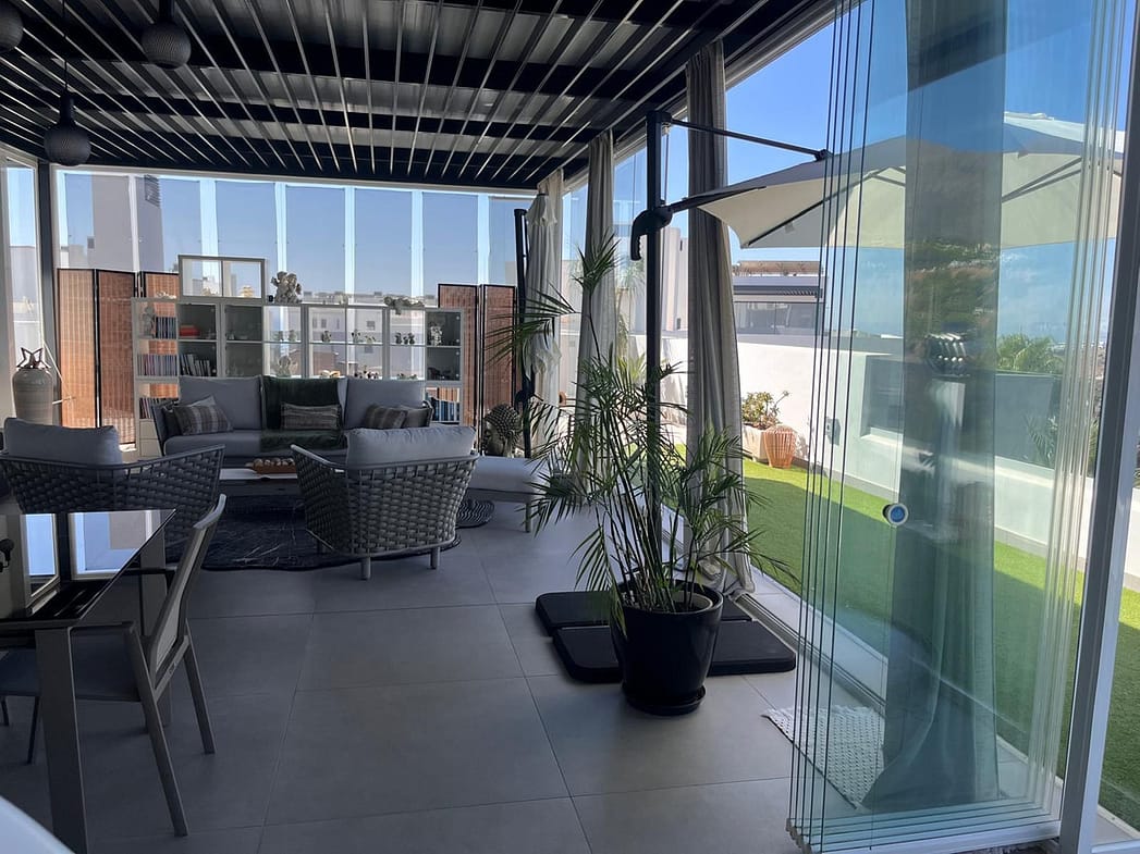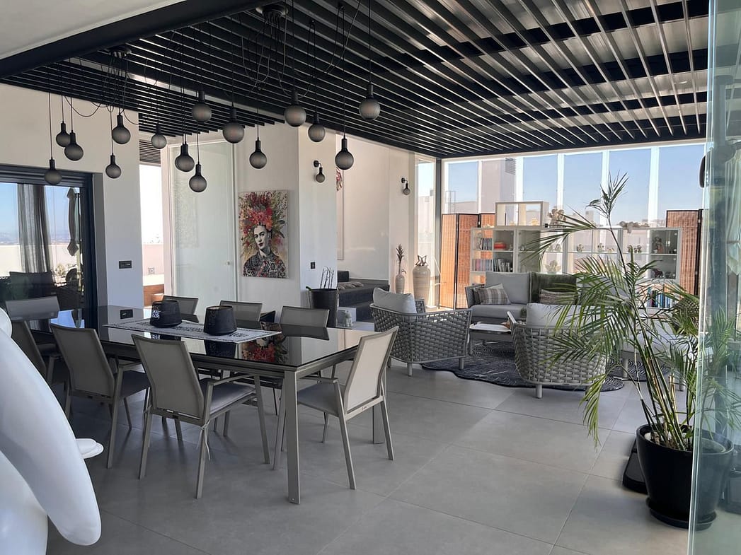 To the left, a bright dining area enclosed with glass curtains invites natural light and panoramic views, providing access to one of the most impressive wrap-around terraces on the Costa del Sol – a perfect setting for year-round outdoor living.