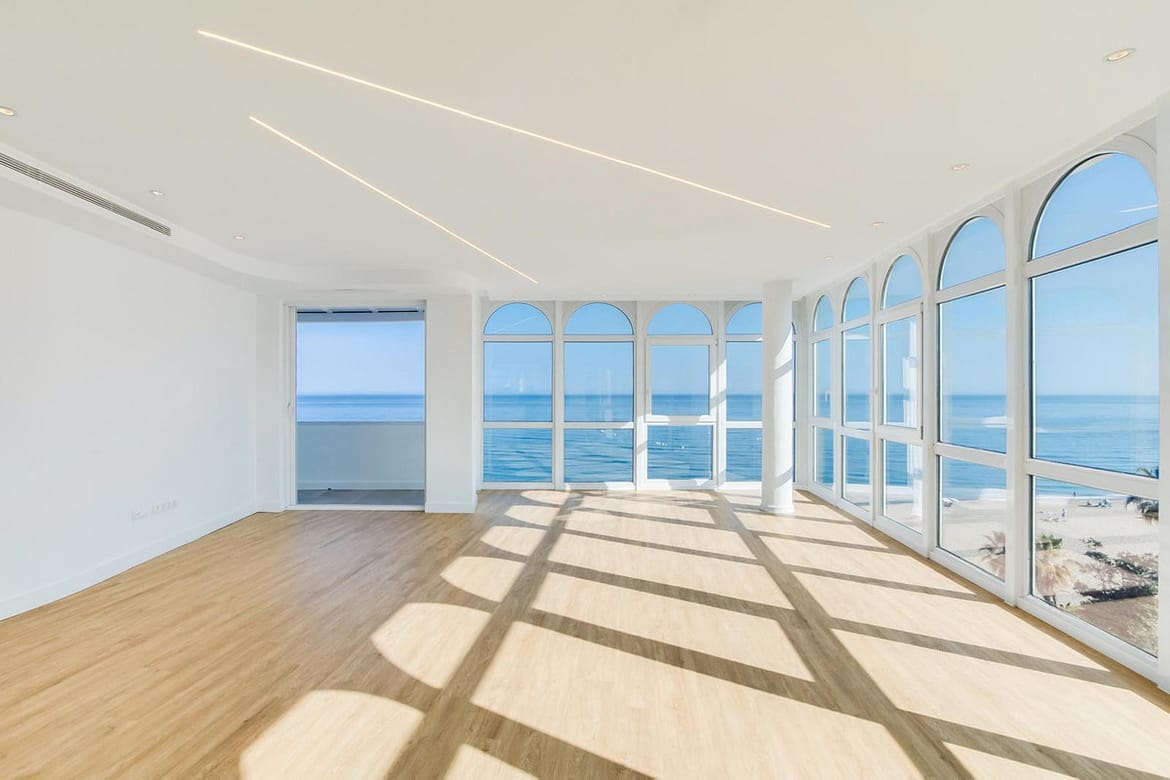 Stunning, south-facing fully renovated, three bedroom beachfront apartment in the heart of Estepona’s charming Old Town offering spectacular panoramic sea views. With a large usable space, the home blends elegant modern finishes with high-end Electrolux appliances in an open-plan kitchen and living area that flows onto a spacious terrace overlooking La Rada beach. The master suite includes a luxurious en-suite bathroom, a large dressing area, and direct terrace access, while the additional bedrooms also boast beautiful sea views and share a stylish second bathroom. The apartment includes ducted air conditioning with room-specific controls, floor-to-ceiling double-glazed PVC windows for maximum light and insulation, and a large private underground parking space. Just steps from restaurants, shops, schools, and public transport, this exceptional property combines beachfront living with urban convenience in one of Estepona’s most privileged locations.