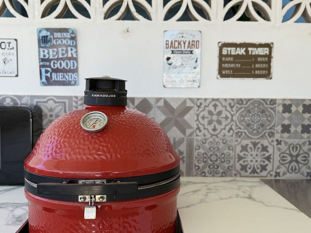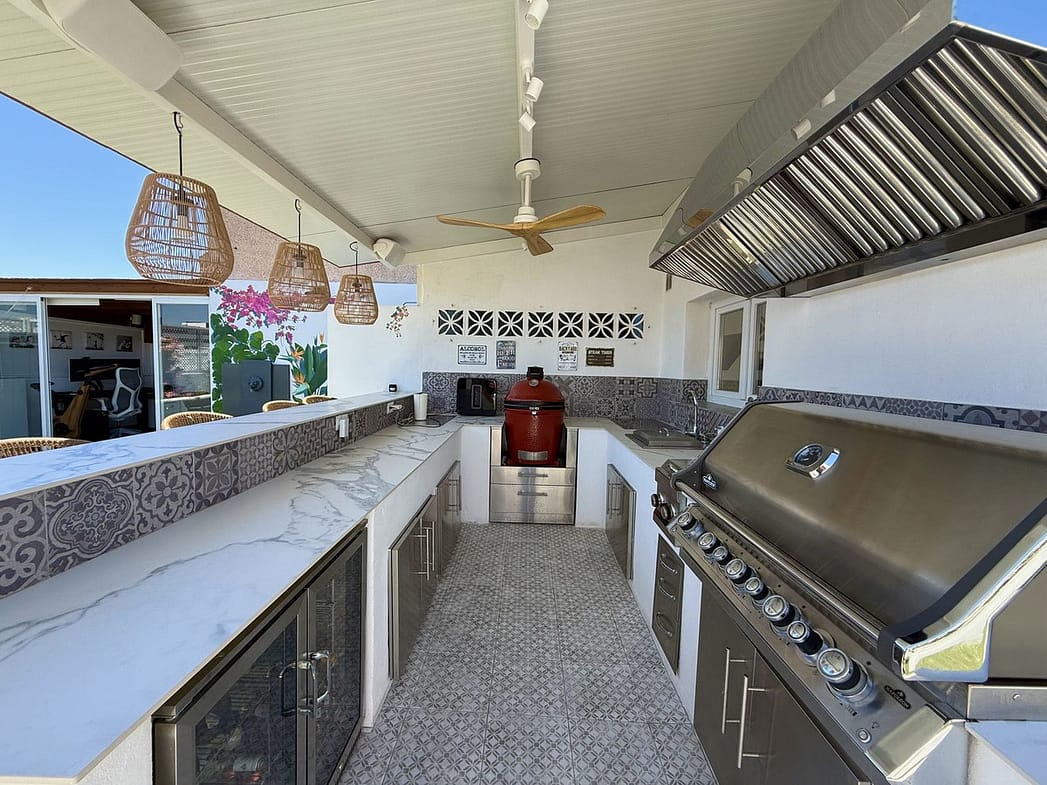 The 98 m² terrace, located on the same level as the apartment, extends the living space outdoors. It includes a fully equipped outdoor kitchen with barbecue, sink, and fridge, a dining area for six, a bar section, outdoor shower, and even a private gym. Part of the terrace is enclosed in glass and currently used as a home office with AC – which can also serve perfectly as an extra guest room.