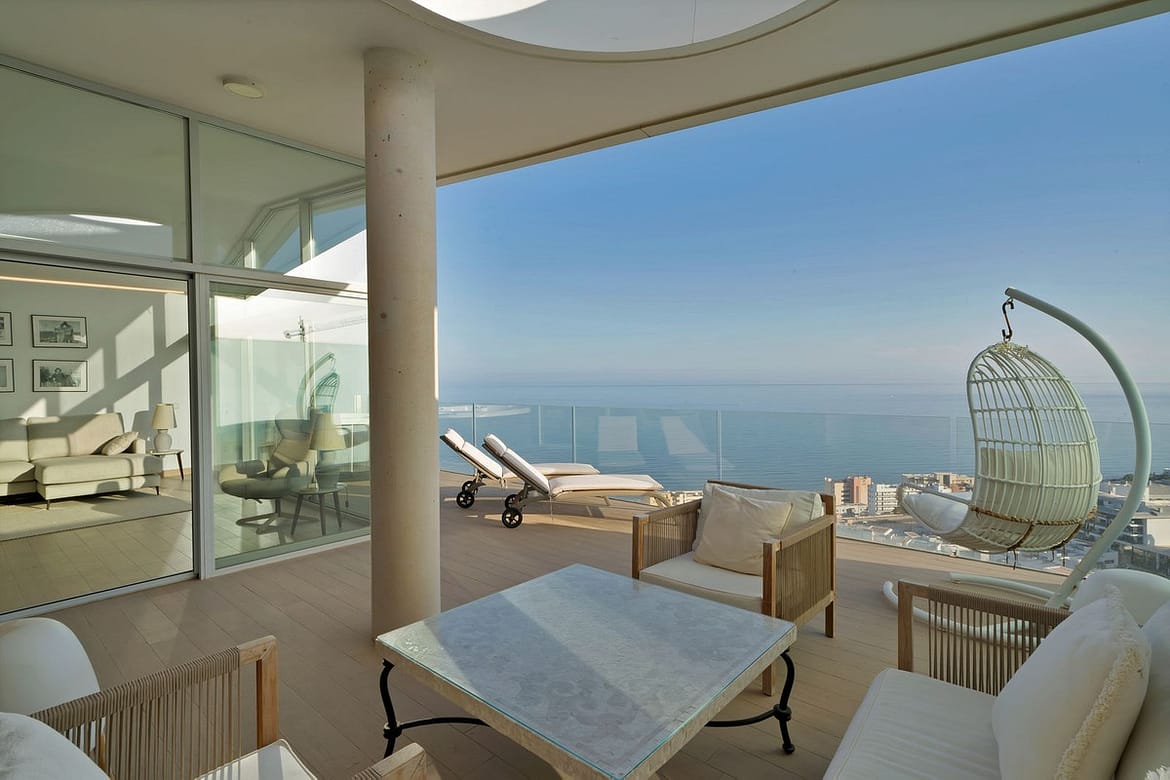 This spectacular penthouse in Residential Med One redefines luxury coastal living. Positioned just 500 metres from the beach, it offers panoramic, uninterrupted views of the Mediterranean from every angle. The bright, open-plan living area is framed by floor-to-ceiling windows, filling the home with natural light. A sleek, open concept kitchen flows seamlessly into the lounge, ideal for both entertaining and everyday living. With a recently added decalcifier system, this home offers enhanced water quality and an extra touch of luxury. The property features three spacious bedrooms with fitted wardrobes and two elegant bathrooms. The master suite boasts a private en-suite complete with a freestanding bathtub, a separate shower, and spectacular views over the Mediterranean. The 44 m² terrace, with both covered and open areas, includes a hot tub; the perfect place to relax, dine, and take in breath taking sunsets. Two parking spaces and a storage room are included.