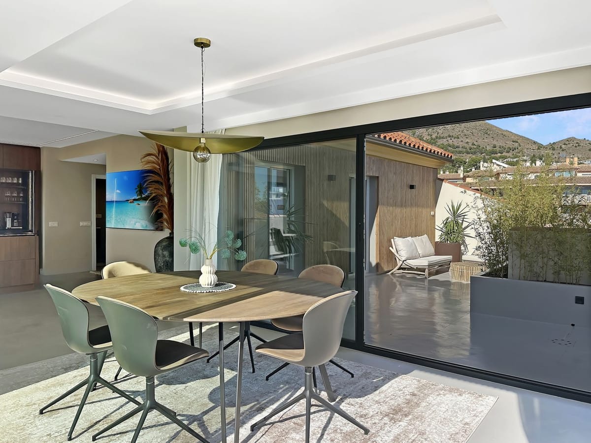 The total property area is 273 square meters, dominated by the impressive 138-square-meter terrace. This exceptional outdoor space is designed for maximum enjoyment, providing stunning, panoramic views of both the sparkling Mediterranean sea and the majestic mountains. The terrace is also prepared with water, drain and electricity installations for the use of a private jacuzzi and awnings.