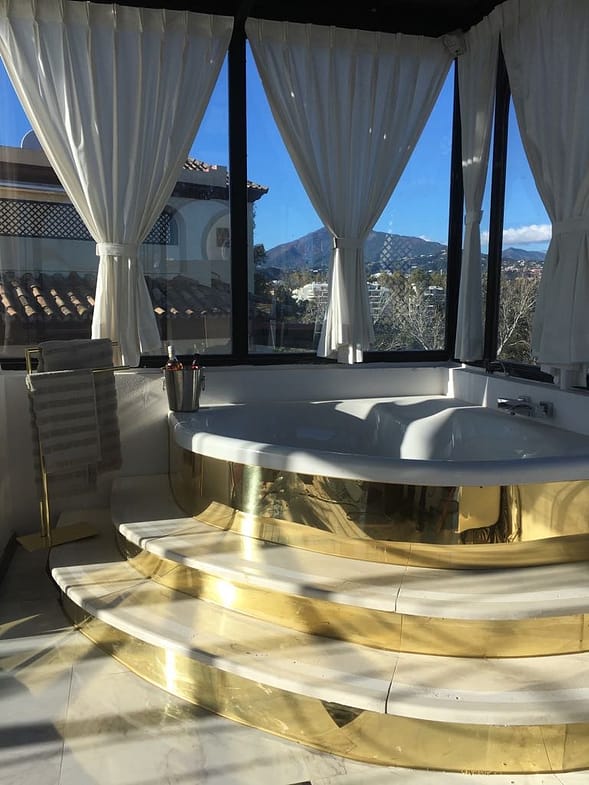 Situated frontline golf in the highly desirable area of Guadalmina Alta lies what is possible the only Art Deco apartment in the whole of Andalucia. This utterly stunning duplex penthouse is located in small quiet complex of apartments away from any road noise and yet just a short distance away from the town of San Pedro and the many restaurants and amenities of Guadalmina. Upon entering the property you immediately get a sense of space and opulence, due to both the distribution and the incredible decor and furnishings throughout the penthouse. On the main level you have an enormous living room with a separate dining area off to the left and a further sitting area off the living room to the right which over looks the Guadalmina golf course. The exquisite furnishings and decor are unique Art Deco pieces from around the world, many of which have great provenance and have come from America via auction houses in Paris, London and Rome. The thought and attention to detail that has gone into this Art Deco property is absolutely outstanding and must been seen first hand to be able to truly appreciate in its entirety. As you would expect, the fully fitted kitchen is in keeping with the rest of the house in terms of both quality and design, and that continues of course through into both the large master suite and the second bedroom with it own adjoining bathroom. A staircase leads from the dining area up to an exquisitely designed conservatory/ bedroom suite with jacuzzi, which again enjoys the amazing views out over the golf course. This in turn leads out onto 65m2 solarium with a Jacuzzi, again all this conforming with the elegant Art Deco style.