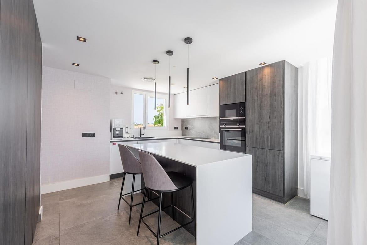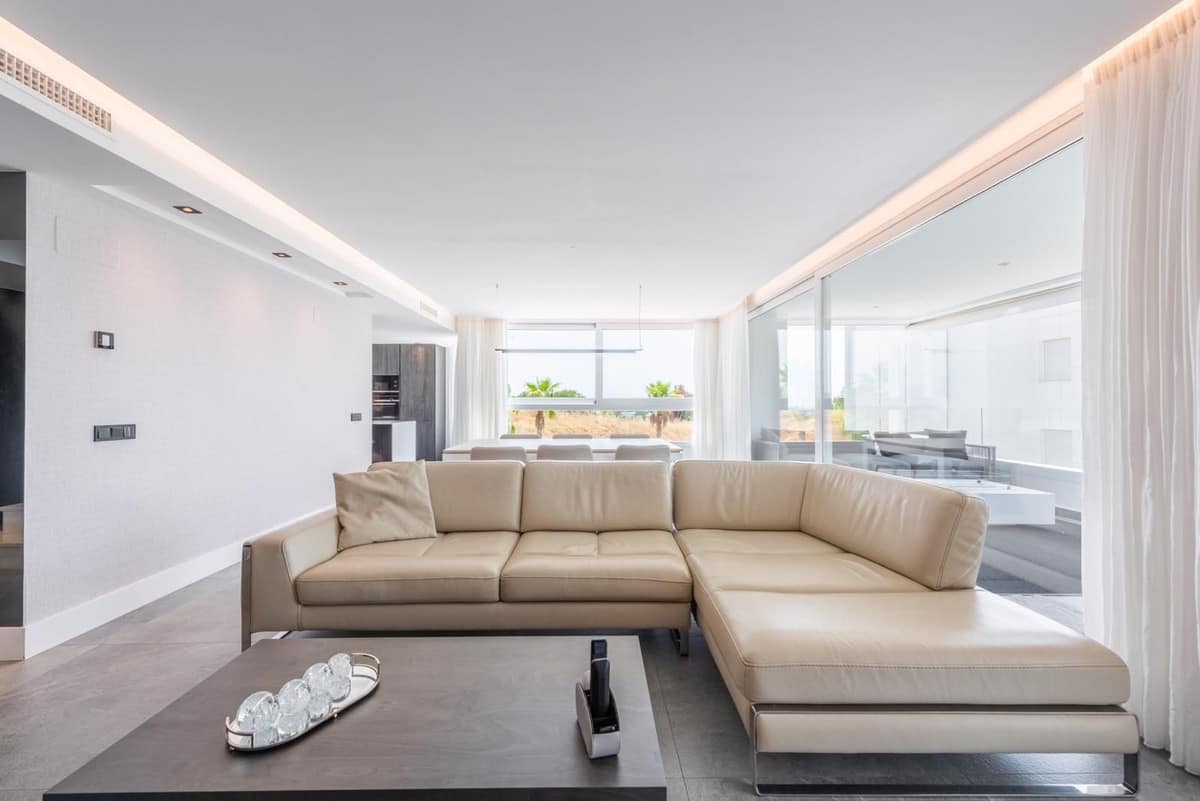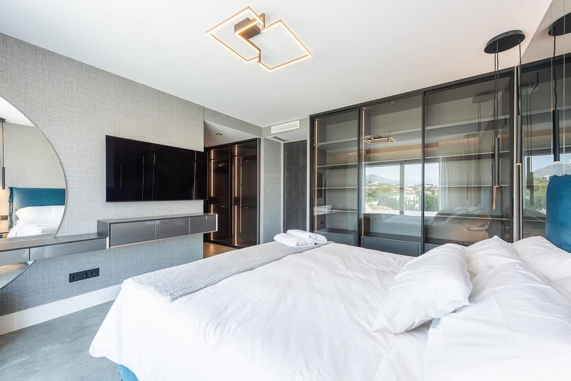 Penthouse – dupex built in 2018, stands out for its elegant contemporary style, has a total of three bedrooms, (two of them on the ground floor), two bathrooms, living room with open kitchen and terrace on the main floor and large terrace on the upper floor with jacuzzi, sauna…etc. From the terrace you can enjoy wonderful views of the sea, golf course, lake and mountains.