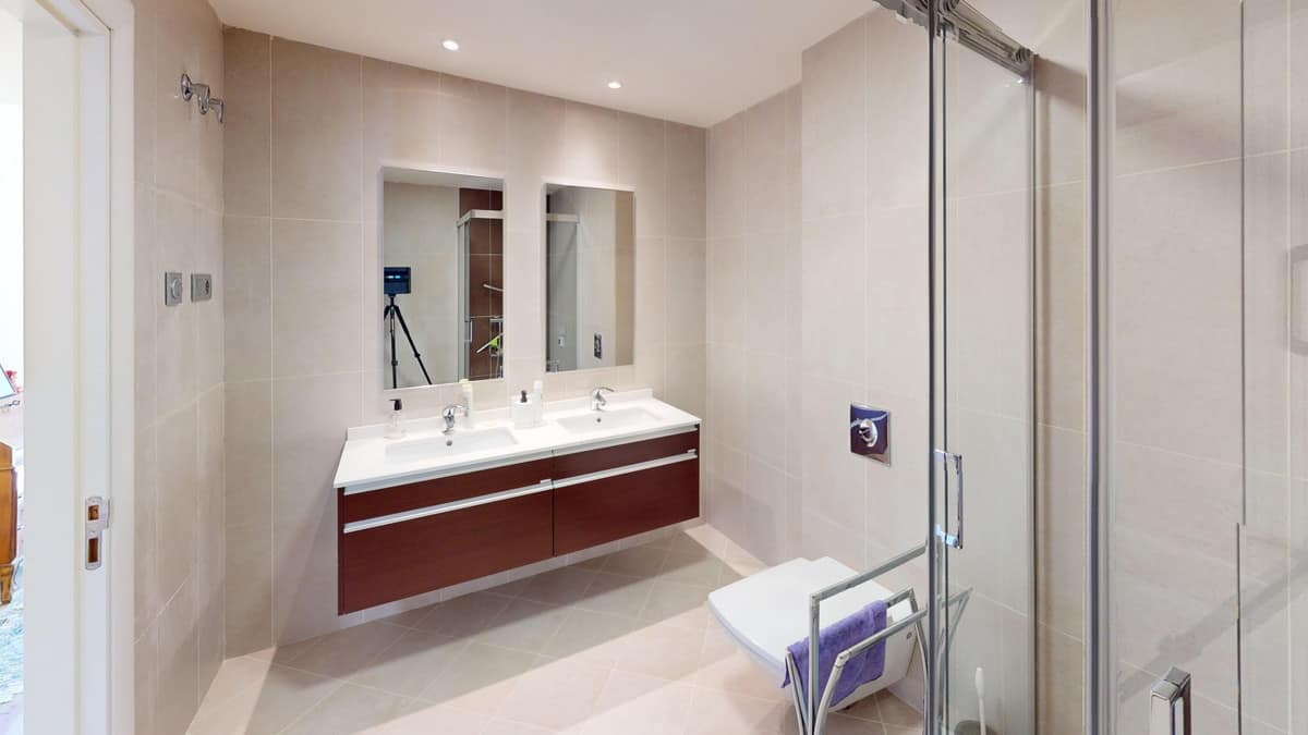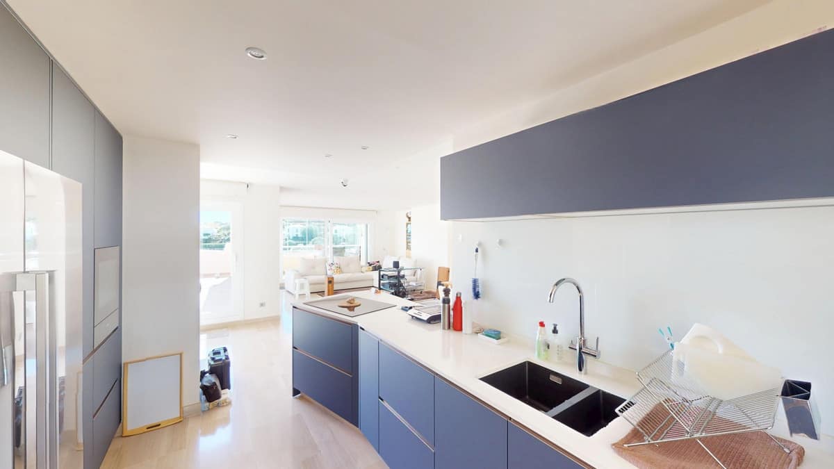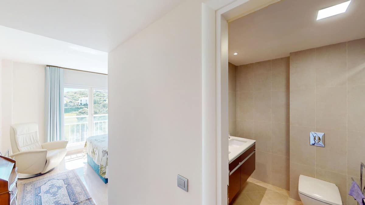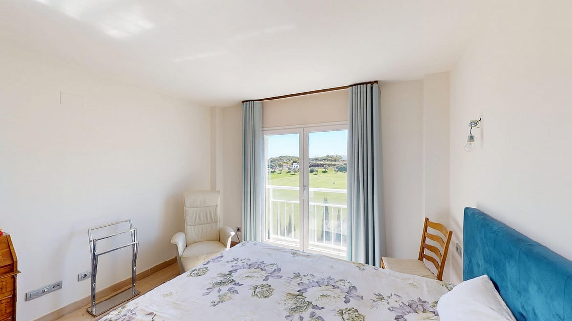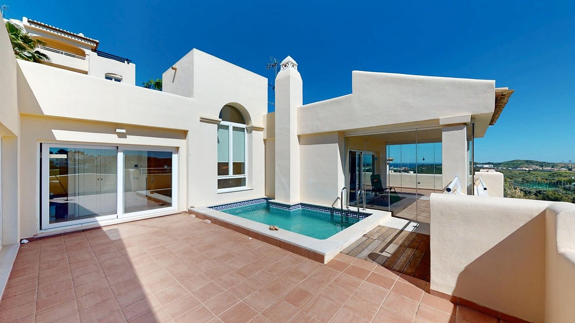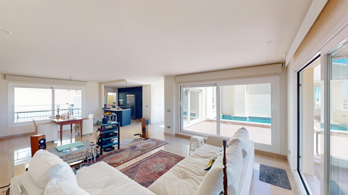 This contemporary penthouse in Mijas, Málaga, offers a harmonious blend of comfort and style. It is located directly on a golf course and offers an impressive view of the sea, so you can enjoy both the tranquillity of the green and the panorama of the coast. The open-plan living area features floor-to-ceiling windows that flood the space with natural light and provide stunning panoramic views of the surrounding landscape. The living room is tastefully furnished with a plush white sectional sofa, accented by vibrant area rugs that add warmth to the polished floors. The sleek kitchen boasts modern navy cabinetry contrasted with white countertops and high-end stainless steel appliances, creating a sophisticated culinary space. The penthouse's three bathrooms are elegantly appointed, with one showcasing a floating double vanity in rich wood tones and a glass-enclosed shower. The primary bedroom is a serene retreat with direct access to a private terrace. It features a canopied bed, a spacious walk-in closet, and a luxurious en-suite bathroom with both a bathtub and a shower. The second bedroom offers equally impressive views and is furnished with a comfortable double bed. A dedicated office space provides a functional work area with a modern desk setup and ample natural light. The crowning feature of this property is the private terrace, complete with a swimming pool and expansive views of the surrounding hills and greenery. Additionally, the penthouse includes two parking spaces and two storage rooms. Residents also have access to excellent communal amenities, including a large swimming pool, a heated pool, and an outdoor kitchen that can be used by everyone. With its thoughtful layout, luxurious amenities, and prime location in Urbanización Cerrado del Águila, this penthouse offers a perfect balance of indoor comfort and outdoor living in the heart of Costa del Sol. We are pleased to be able to present this dream property to you soon, either personally or via virtual viewing. Because this world is unique – just like our Axarquía. In Andalusia. On the Costa del Sol. Here, on the sunny side of life…