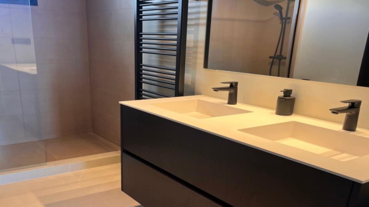 The penthouse is in good condition, with fitted wardrobes, a storage room, and a garage space included in the price. It is equipped with air conditioning and individual hot and cold air heating via heat pump, providing year-round comfort.