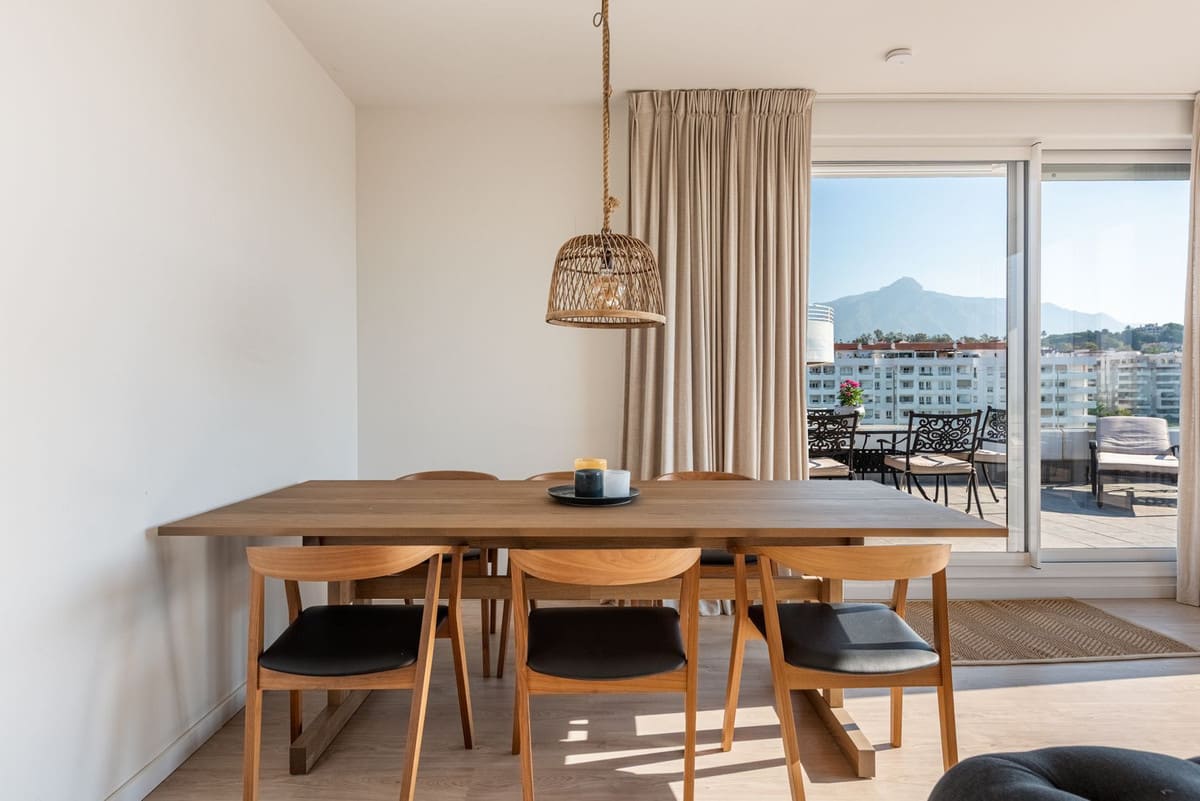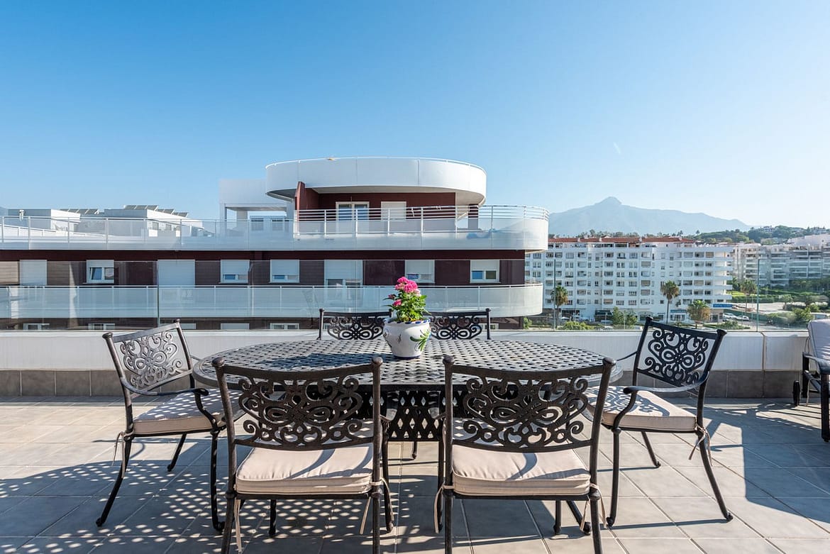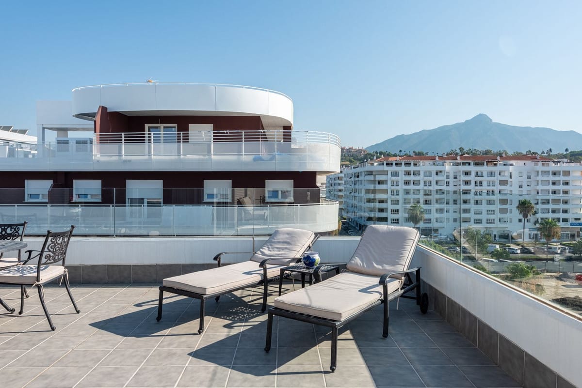We are pleased to present this bright and modern penthouse in the best location in Nueva Andalucía! Enjoy modern living within proximity to all the amenities you need; grocery stores, bars, restaurants, schools, health center, golf courses, gym, and much more. A perfect choice for both families and investors. In a 20-minute walk you will reach the sea and the lovely promenade that stretches from San Pedro via Puerto Banús to Marbella Center. The apartment has three bedrooms, two bathrooms, a kitchen, a living room, and a terrace with generous spaces for relaxation and entertainment. A garage space and a storage room are included. Don't miss this unique opportunity to invest in one of Marbella's fastest-growing residential areas!