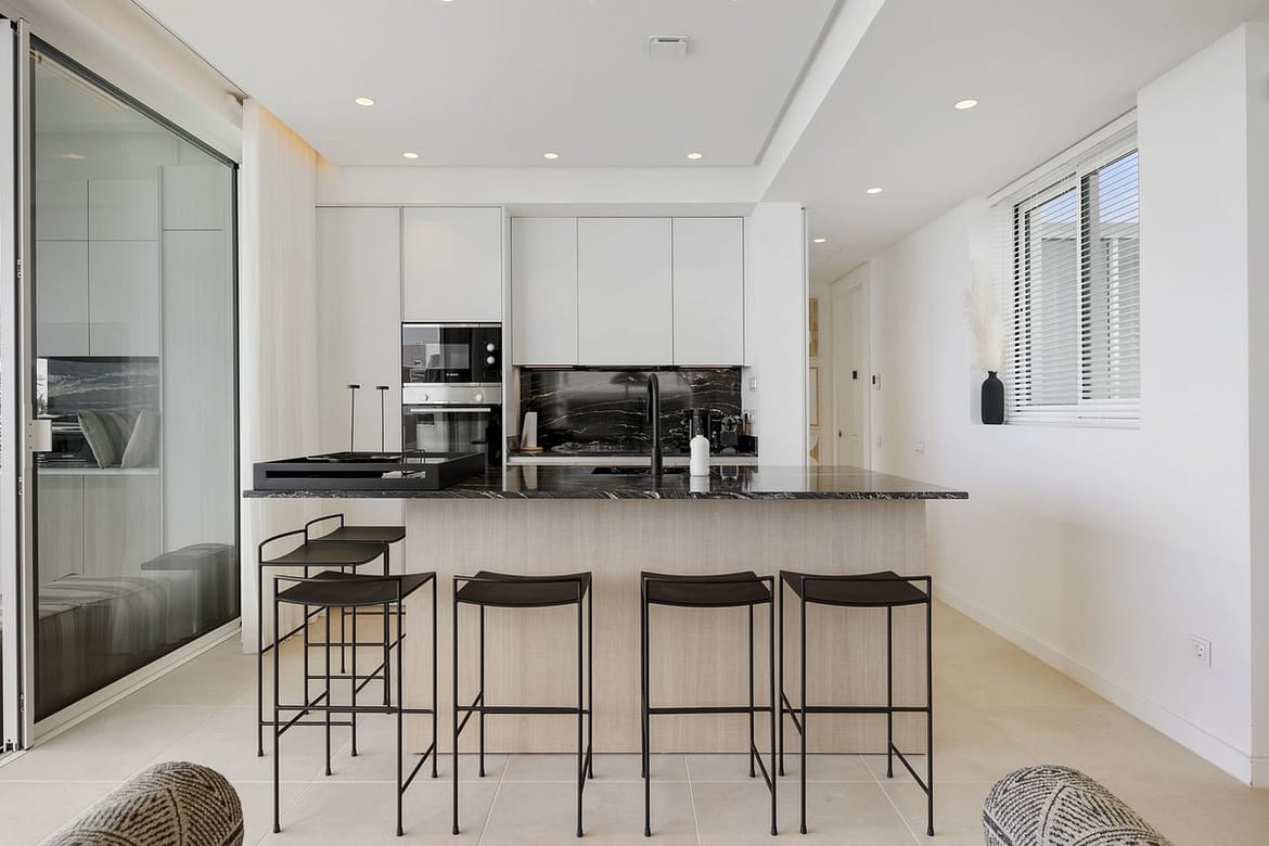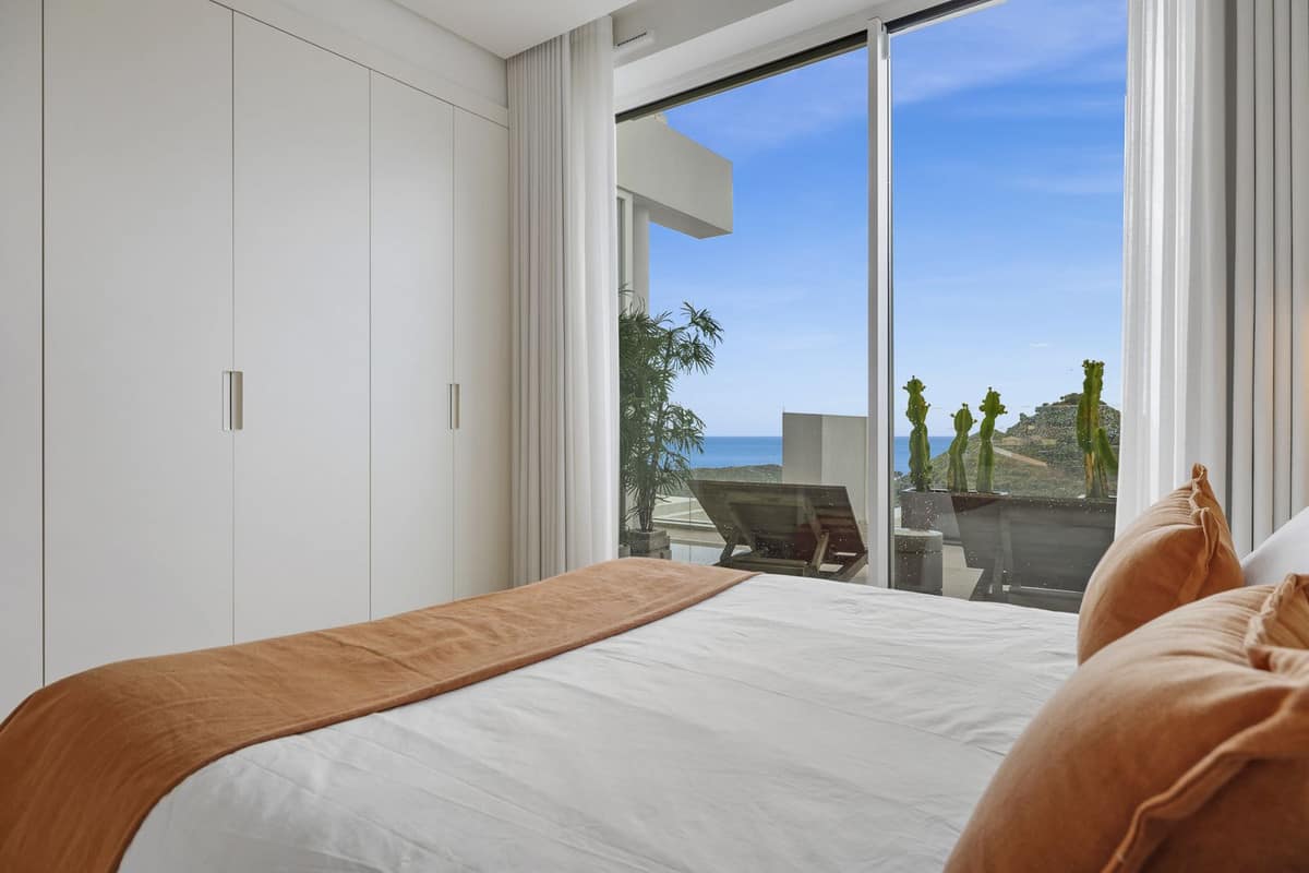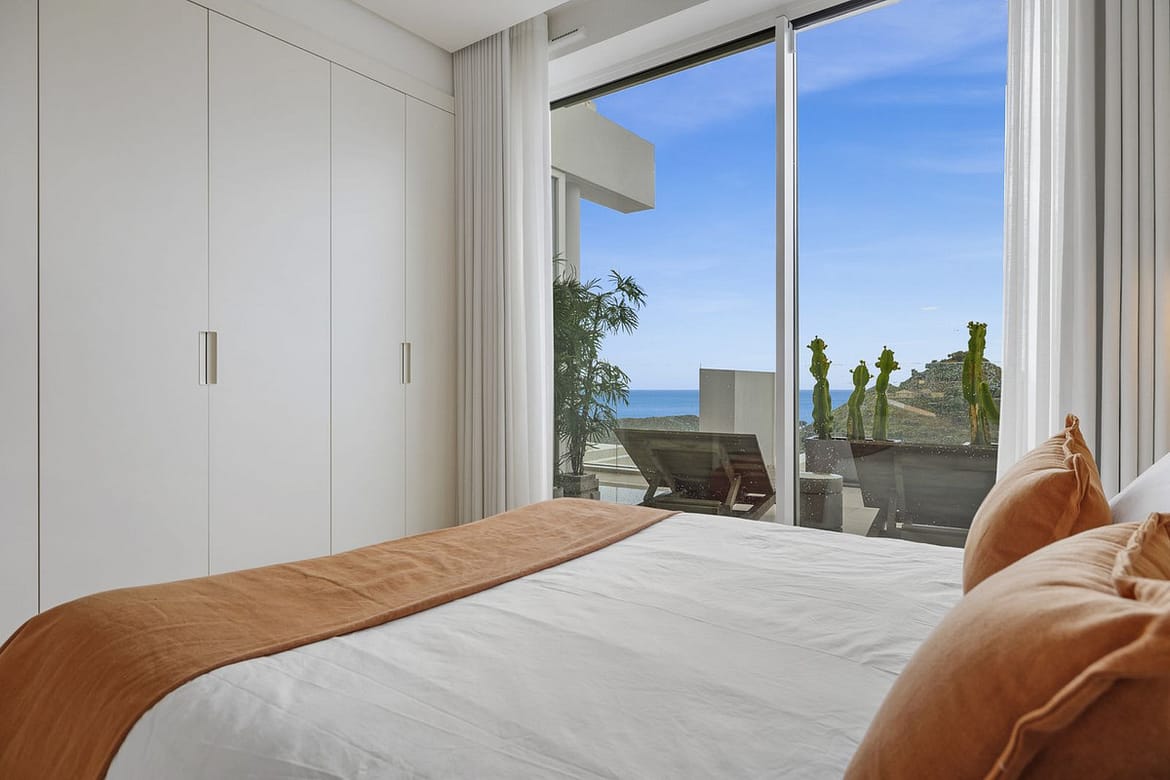 Bathed in natural light, this sophisticated home boasts a spacious sun-drenched terrace with a sought-after southwest orientation, offering uninterrupted views of both the Mediterranean Sea and the Sierra de las Nieves mountains. Floor-to-ceiling sliding glass doors connect the open-plan living area and the master bedroom directly to the terrace, creating a seamless indoor-outdoor flow.