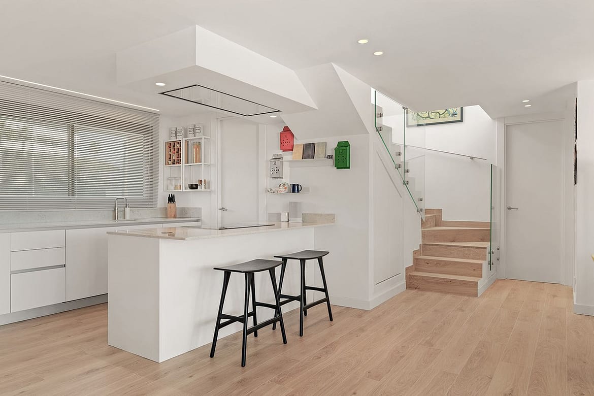 The entrance hall with wardrobe opens up to the spacious living room with open plan and fully equipped kitchen. There is an annex utility room to the kitchen.