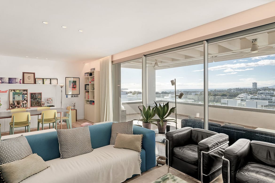 The living room with designated dining and lounge area is very wide and gives access to the covered terrace with open views to the sea and mountains.