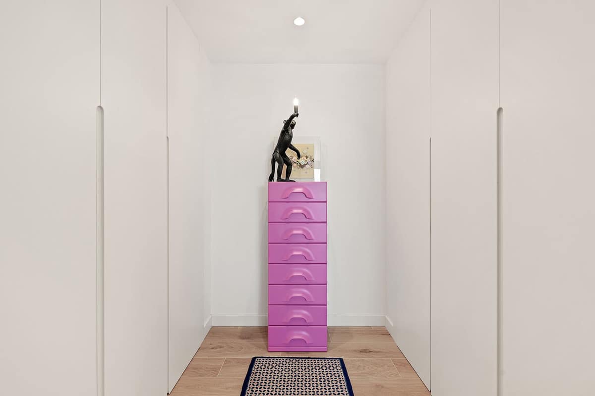 Under the staircase leading to the solarium is a handy storage room.