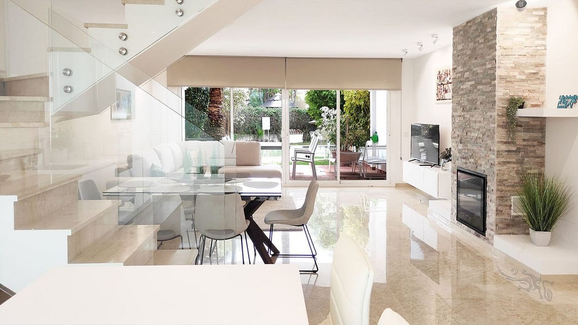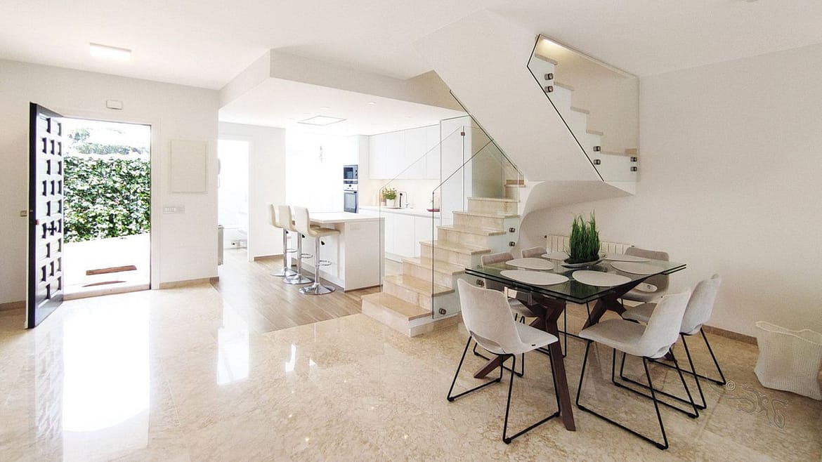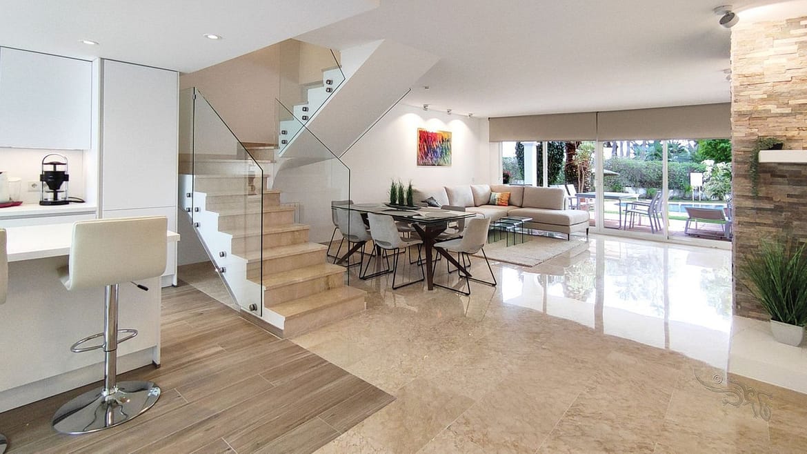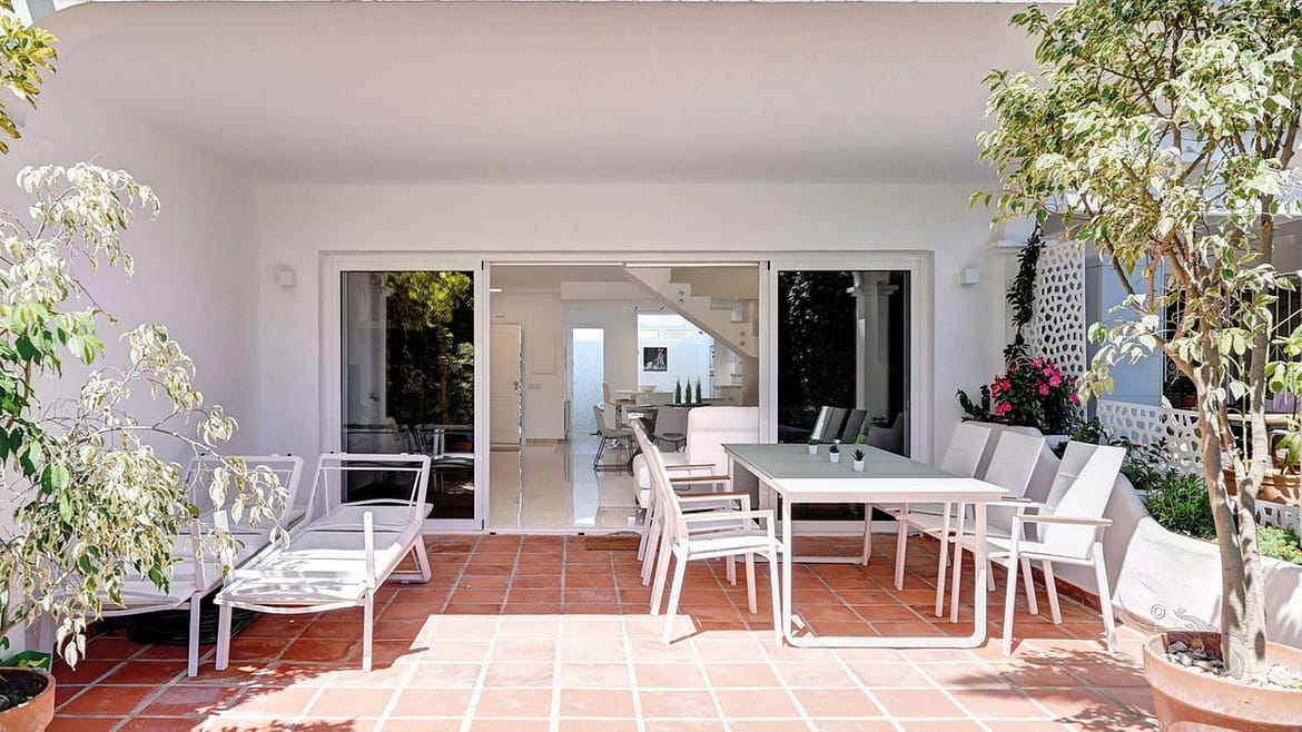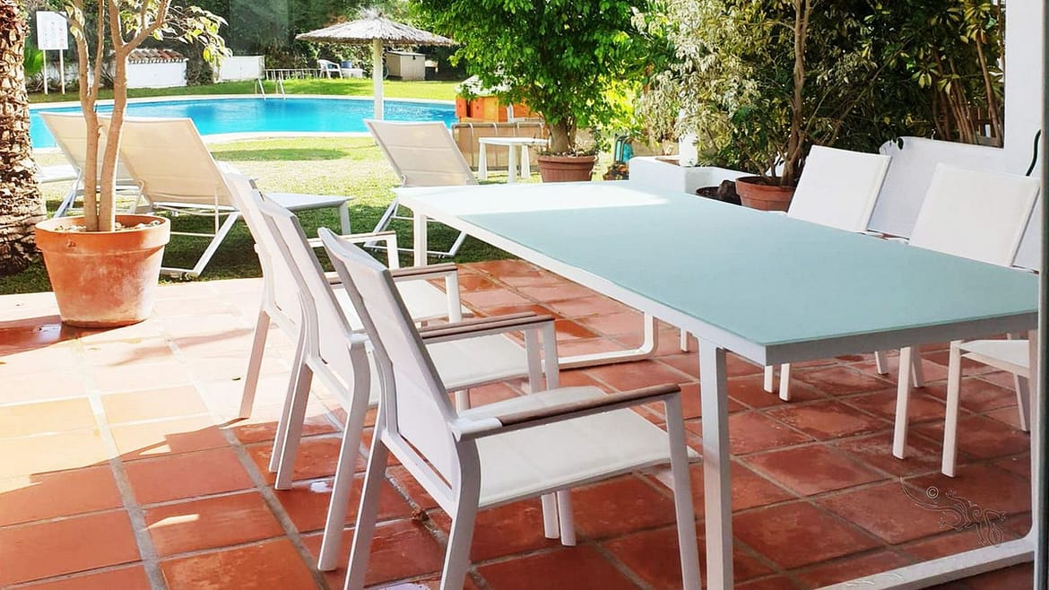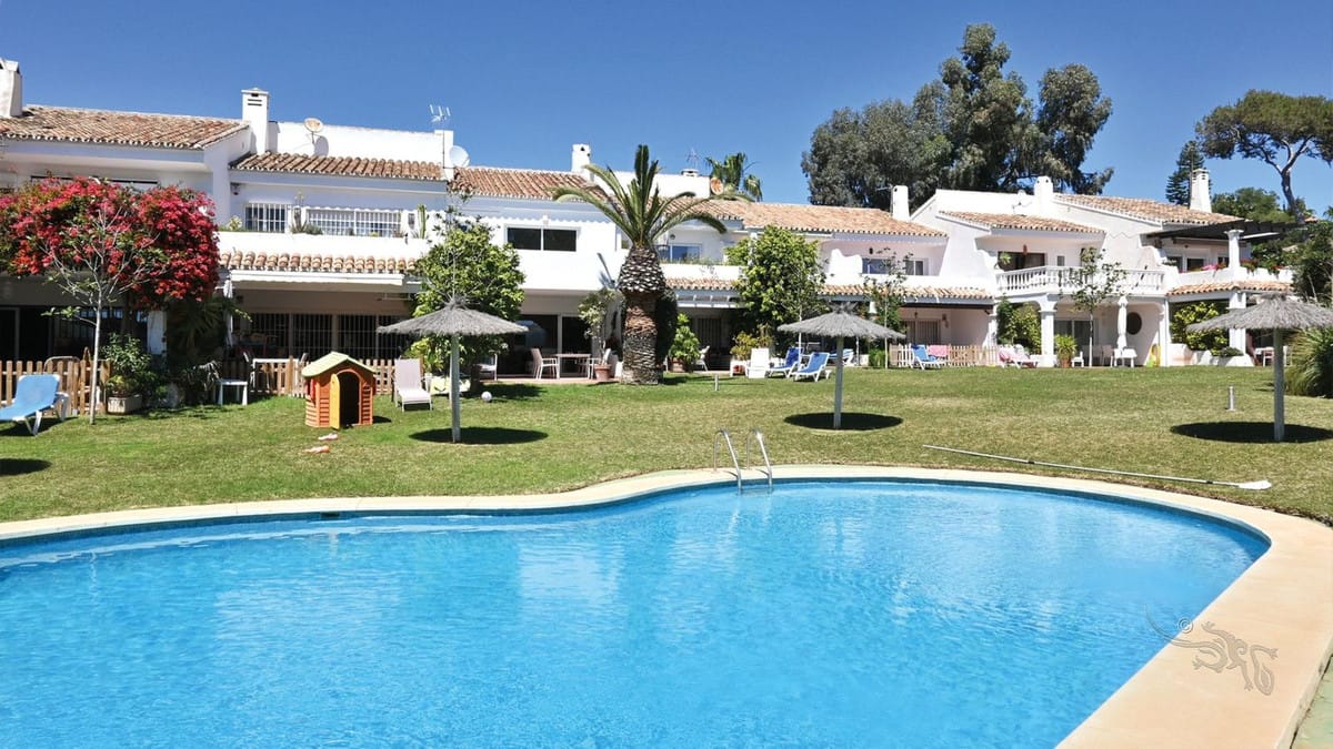 This very modern vacation home was extensively renovated in 2022 using high quality materials and a successful mix of styles and is located on the most beautiful sandy beach east of Marbella, in a quiet and small community with 9 terraced houses. It is surrounded by a large garden with pool and private tennis court. A private residential street leads to the complex, between Costabella and Las Chapas Beach, which ends directly at the beach. There is plenty of public parking space in front of the property and one covered parking space belongs to the house.