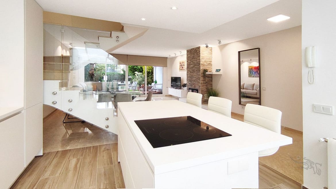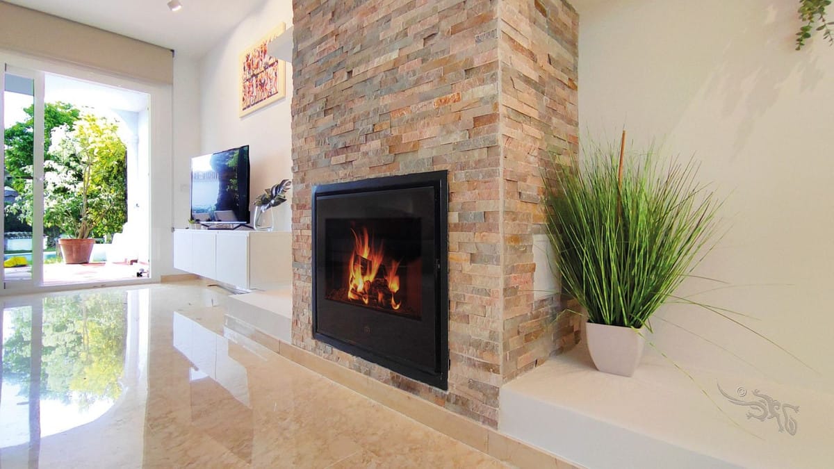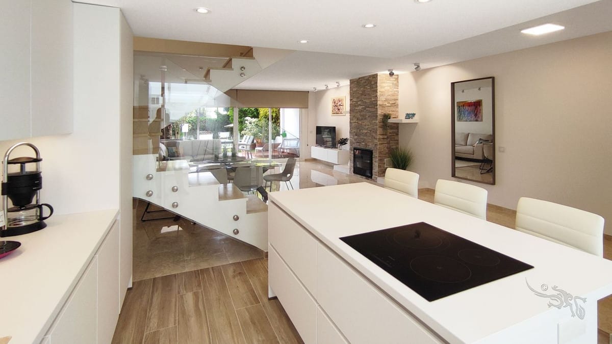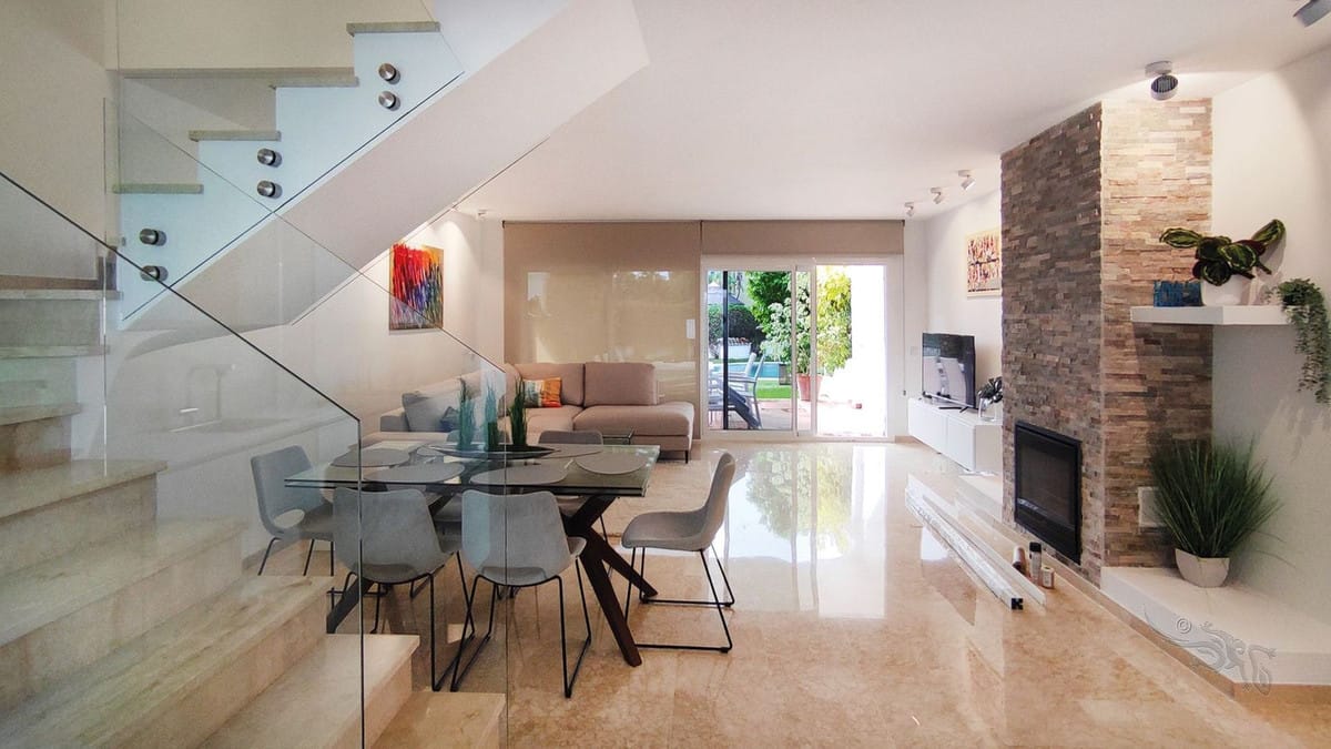 The house is fully and well furnished, distributed on two levels and equipped with air condition and heating in all rooms. The impressive living level was designed completely open, modern and very bright. A special eye-catcher here is the extremely decorative fireplace which forms a refined contrast to the modern elements.