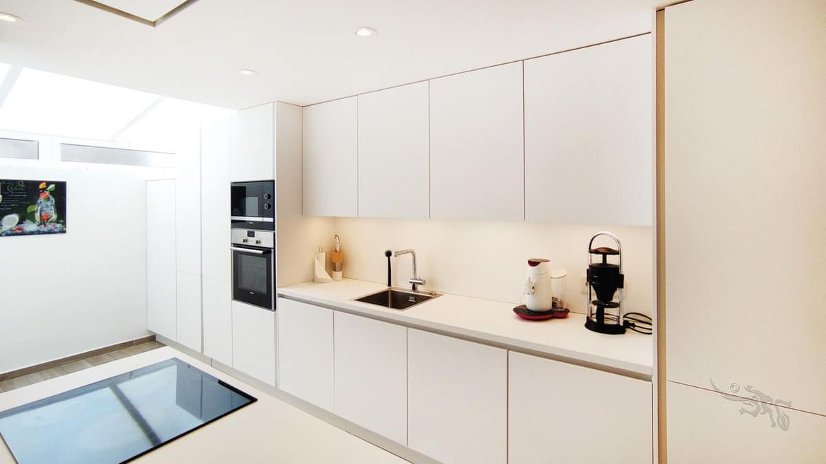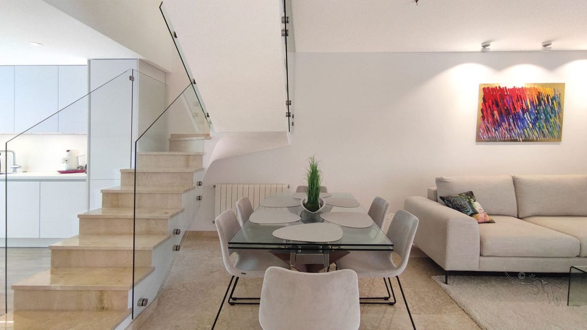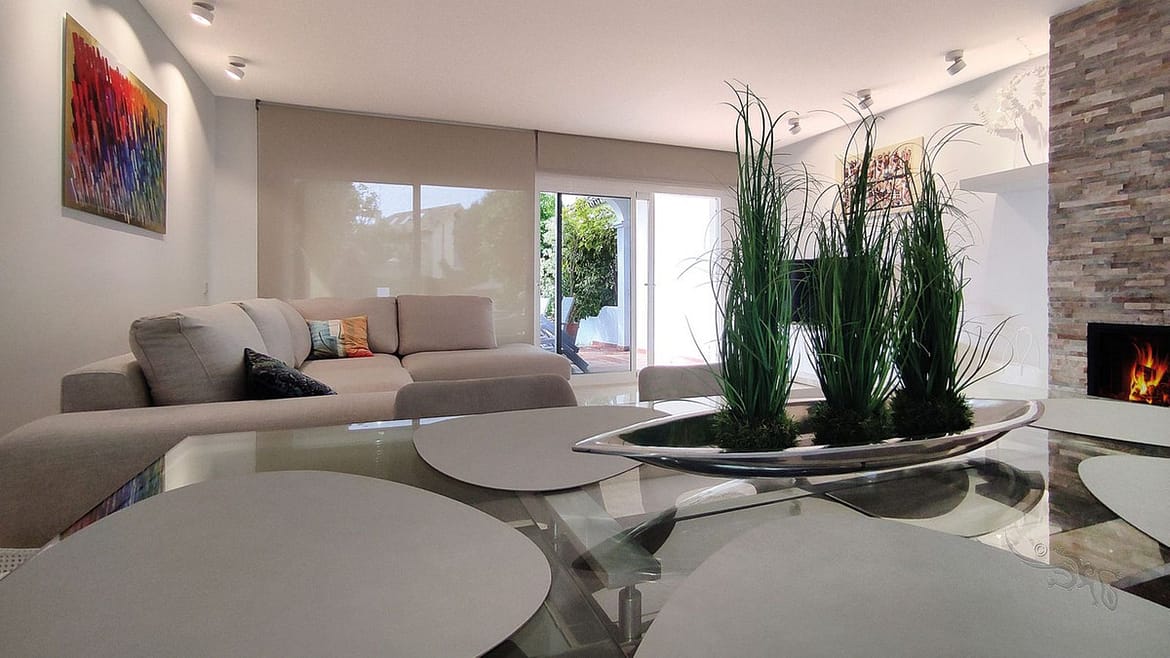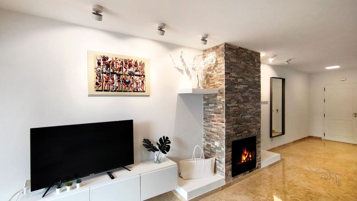 The house is fully and well furnished, distributed on two levels and equipped with air condition and heating in all rooms. The impressive living level was designed completely open, modern and very bright. A special eye-catcher here is the extremely decorative fireplace which forms a refined contrast to the modern elements.
