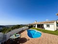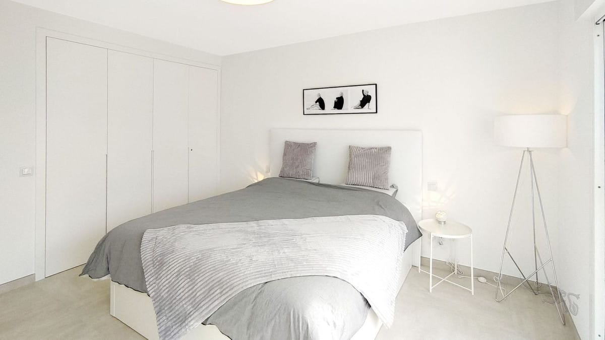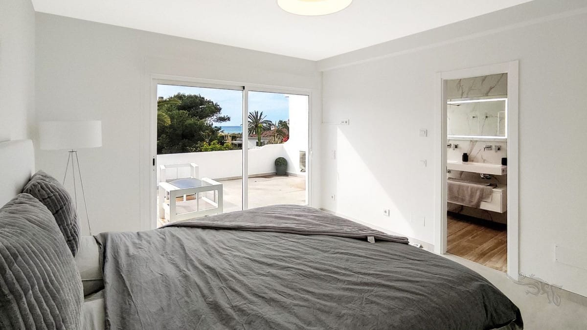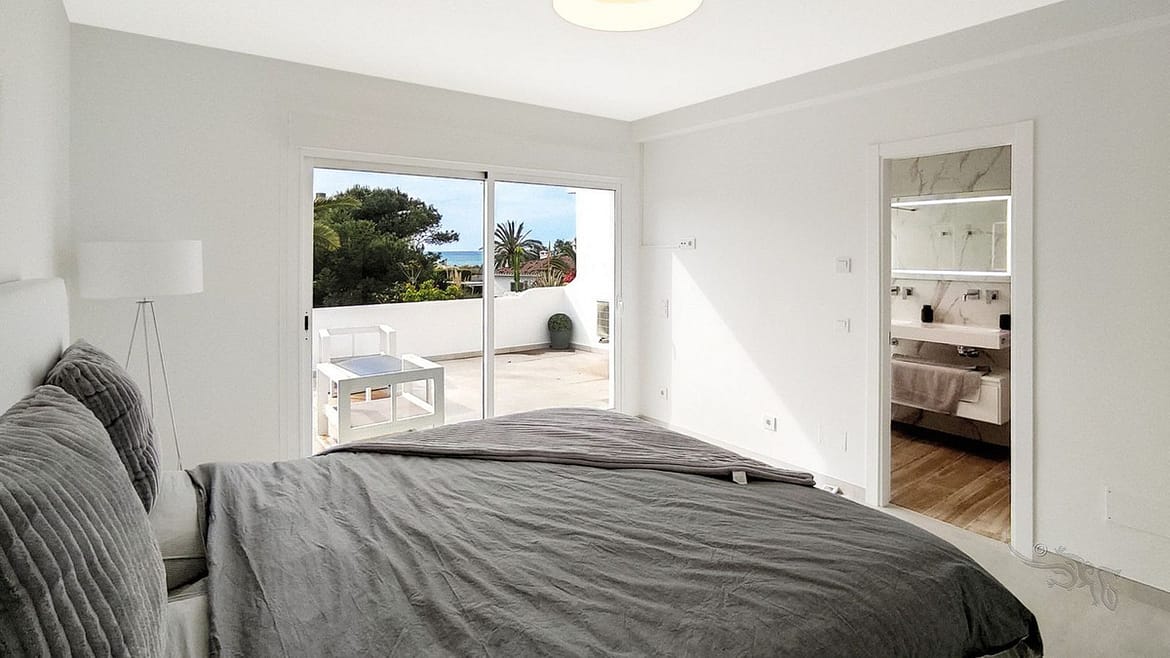 The three bedrooms are furnished with a king size bed in the master bedroom and one queens size and two single beds in the other bedrooms as well as spacious built-in closets in each. The light-flooded master bedroom has a bathroom en suite and large terrace windows provide a beautiful view of the sea and lead to the terrace in front with a cozy lounge that invites you to enjoy your holidays day. From there you also have a view of the pool and the garden.