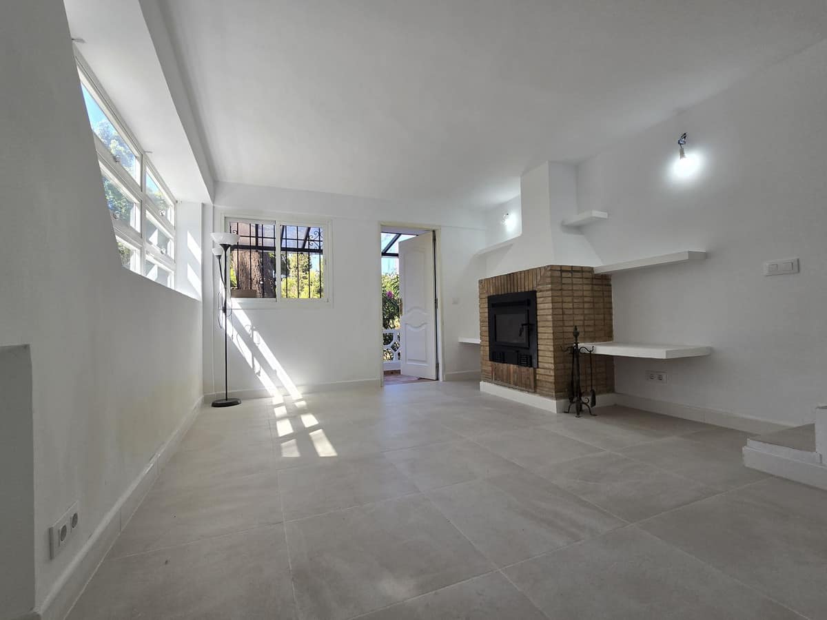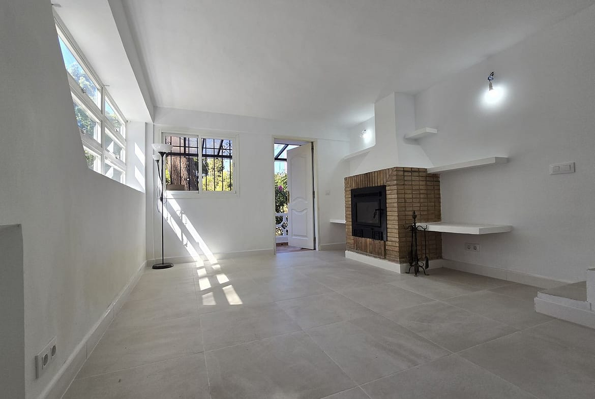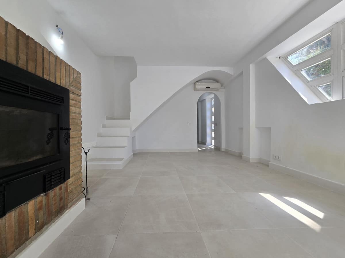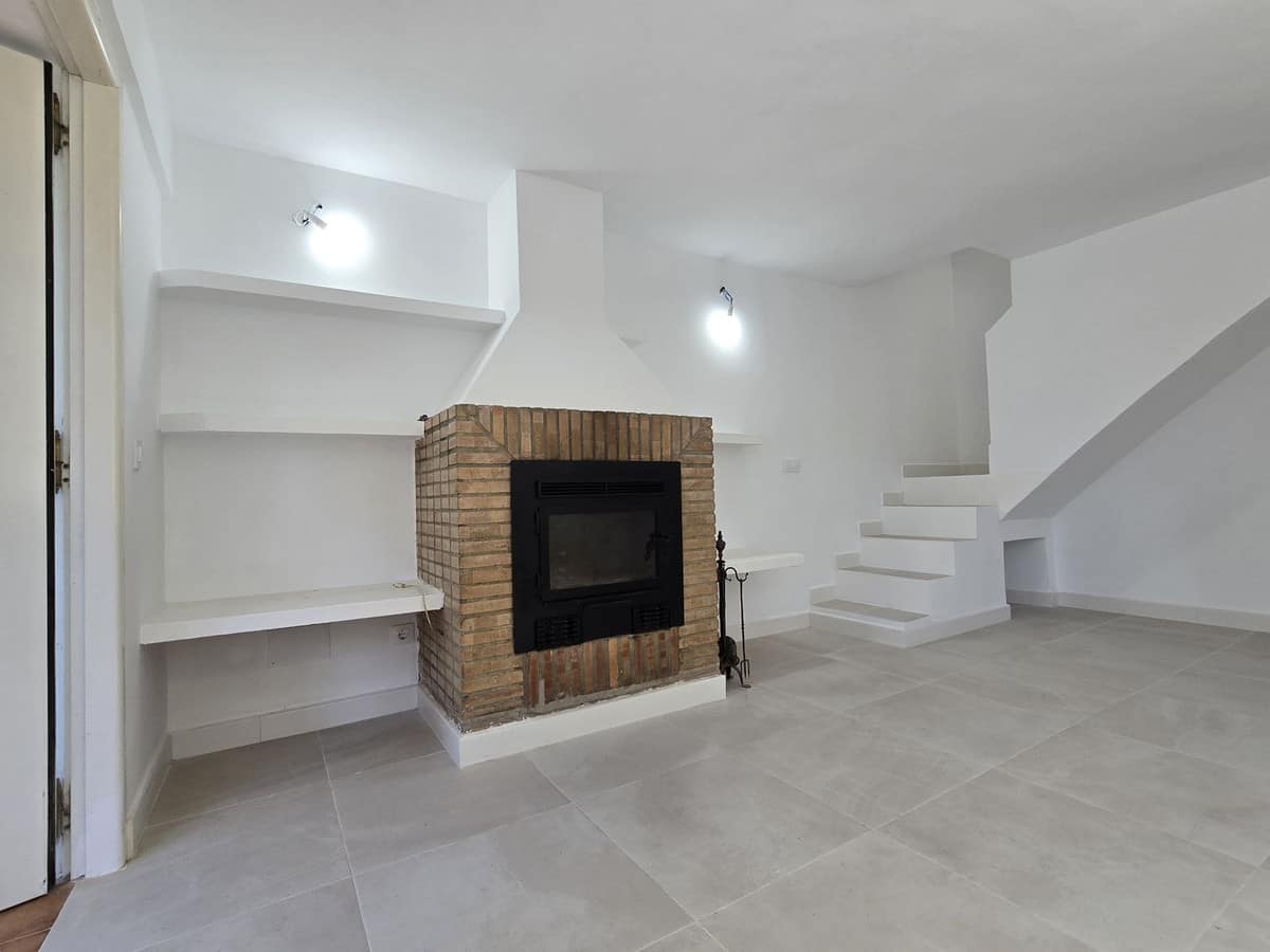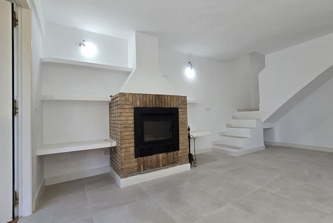 The ground floor comprises a porch-terrace, a living room with a fireplace, a full bathroom, and a brand-new fitted kitchen equipped with fridge, dishwasher, washing machine, ceramic hob, and oven.