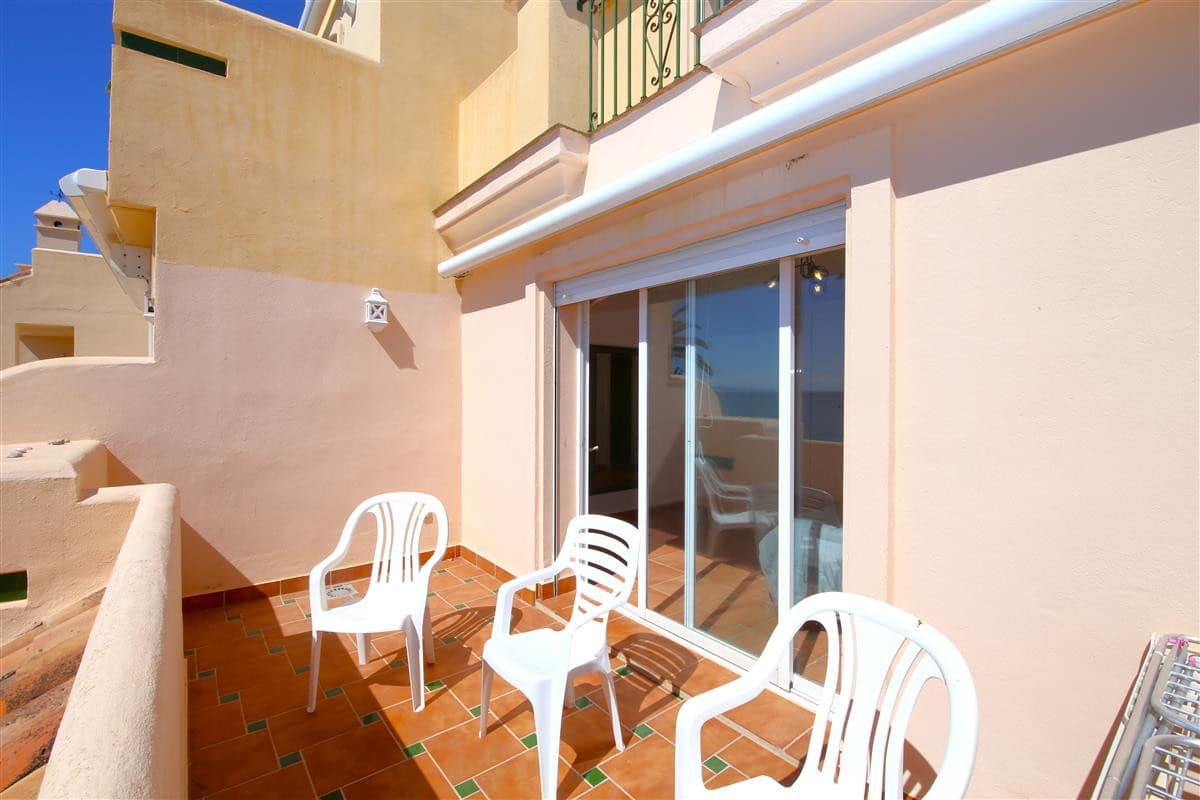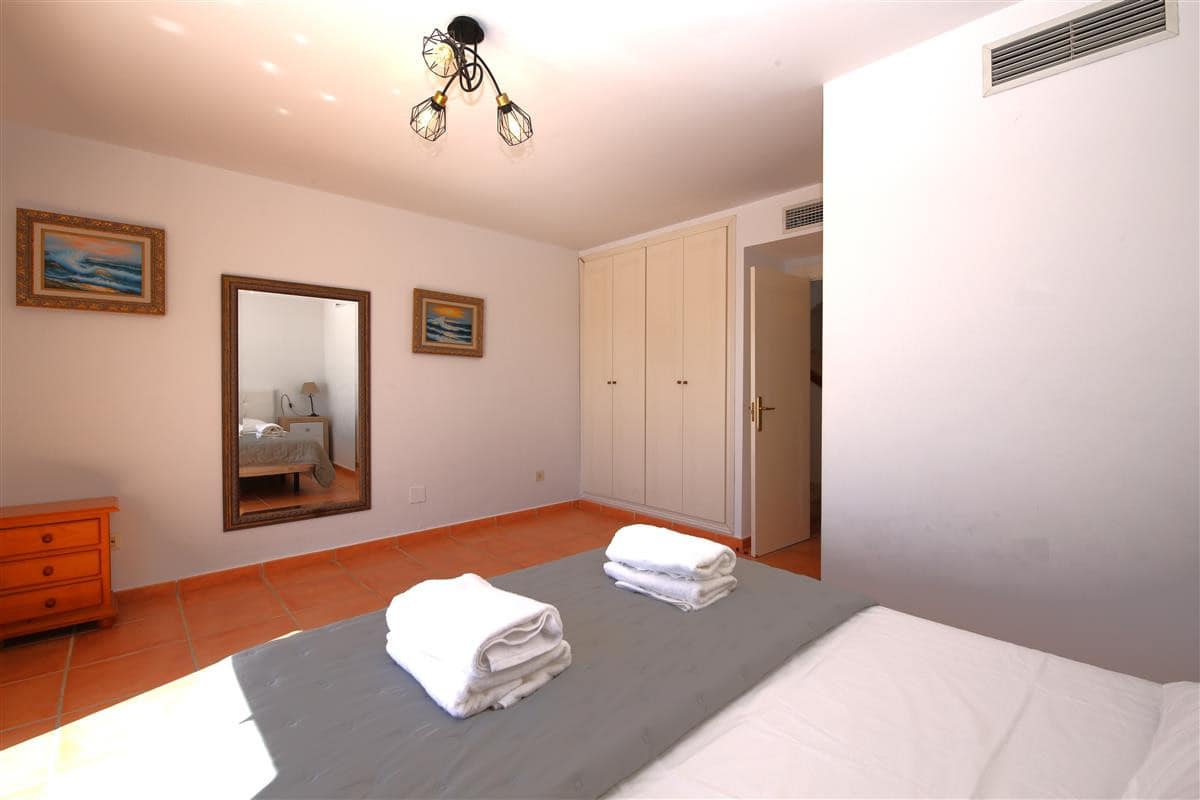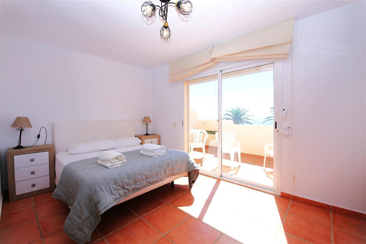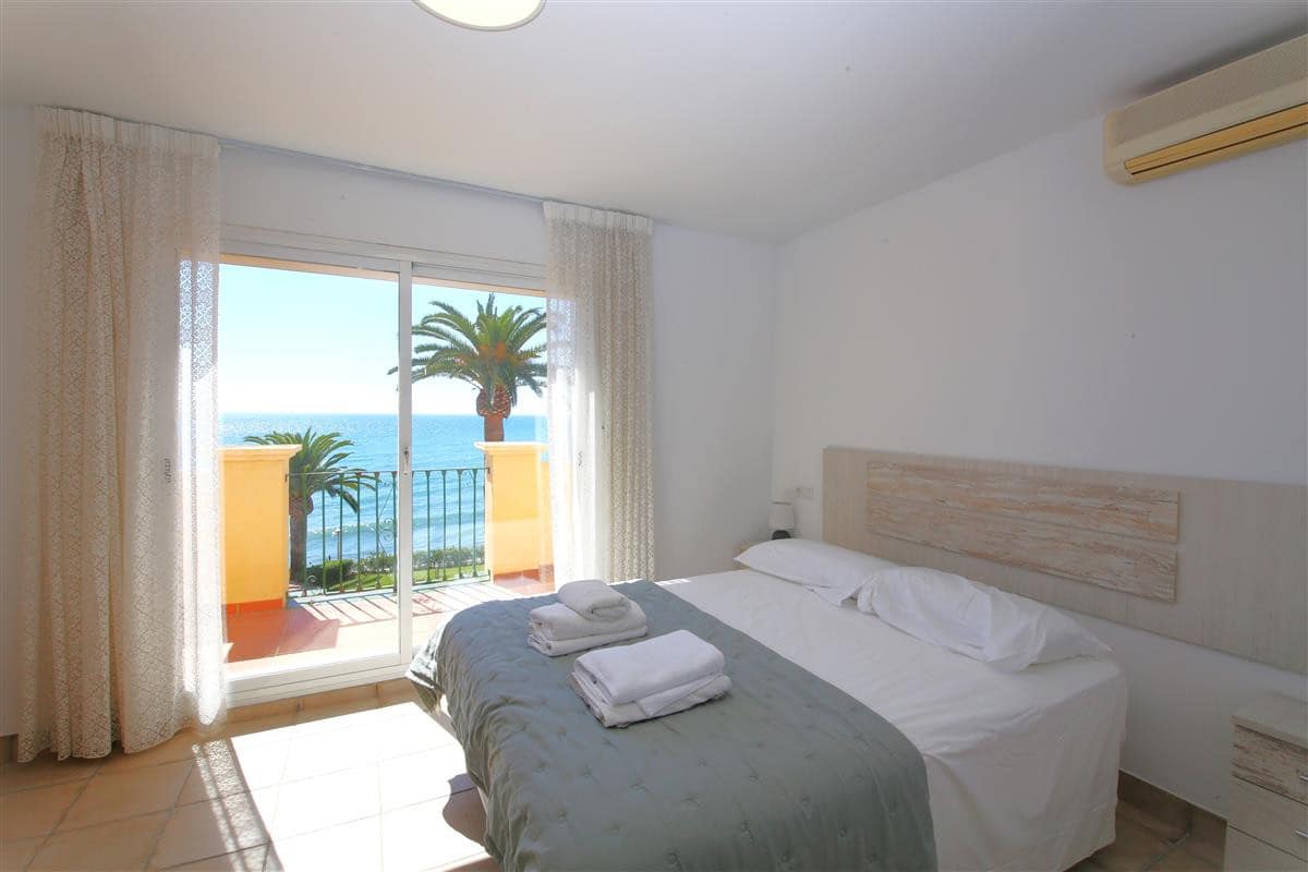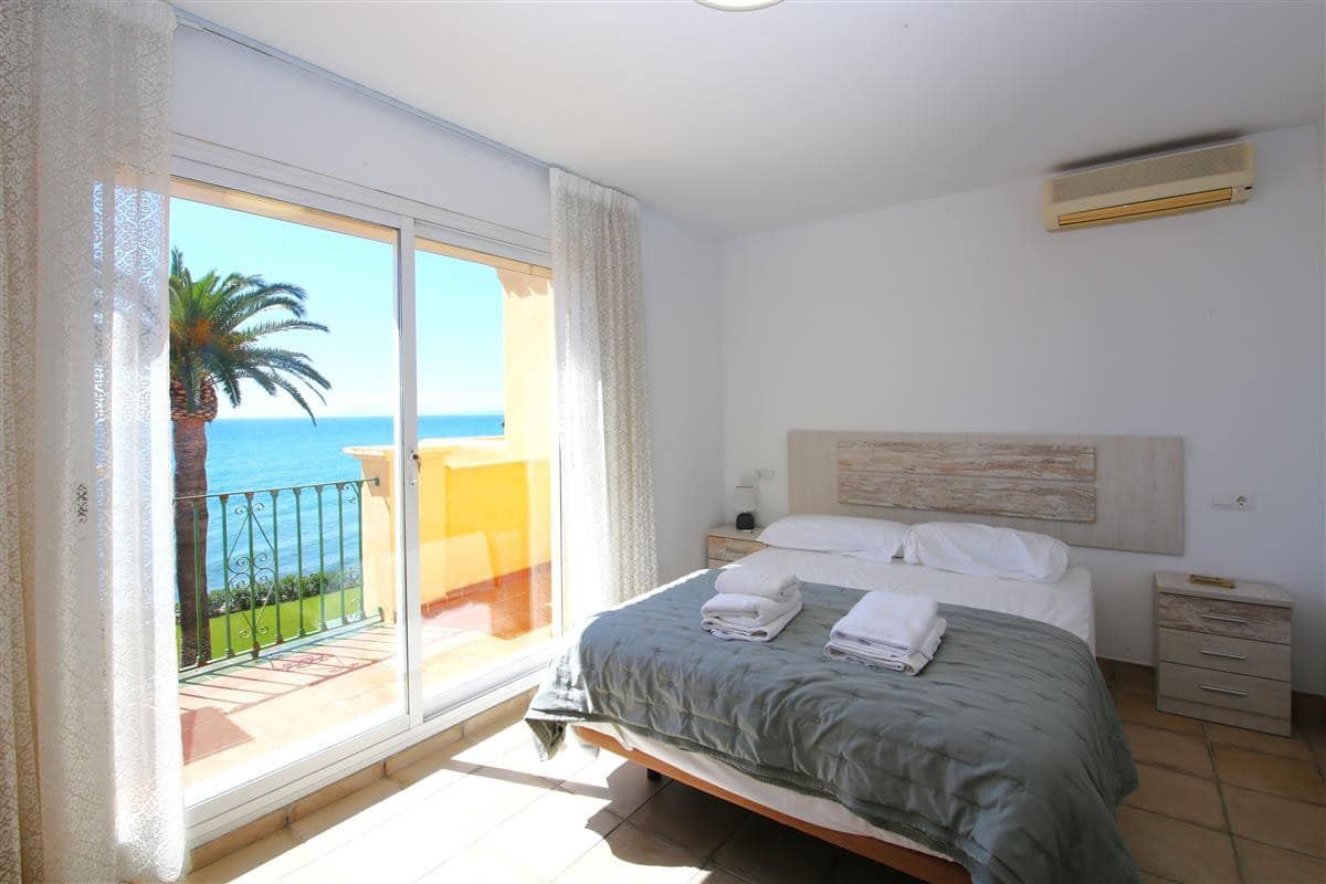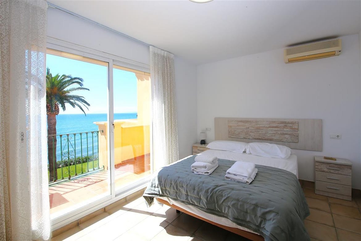 A beautiful and spacious three-bedroom townhouse located in a quiet beachfront urbanisation just outside Estepona town. The house is presented in three levels. When entering the property, we find the fully equipped kitchen to the left and it is equipped with everything you may need for a family holiday and it also has a small laundry room. There is also a guest cloakroom to a side of the corridor with WC and hand basin. The spacious living room has a dining area with seating for eight guests and a lounge area with comfortable sofa and a large flatscreen TV with plenty of international channels including Sky. The lounge has direct access to the patio terrace through the sliding doors that offer light and create a cosy atmosphere offering uninterrupted views of the gardens, pool and the sea. The terrace has an extra outdoor dining area for up to eight guests and extra comfort seating along with a gas powered BBQ. From the patio terrace we can access the well-maintained community gardens and the inviting community swimming pool with sea views. On the first floor we find two of the en-suite bedrooms. Both en-suite bathrooms in this floor are equipped with bath, overhead shower, WC, bidet and hand basin. The first bedroom has one double bed and two singles and the second bedroom has a king-size bed with a private balcony with sea views. On the top floor is the master bedroom with king-size bed and a modern en-suite bathroom with a large walk-in shower, WC, bidet and hand basin. It also has a small private balcony with lovely views to the sea and like the other bedrooms, is equipped with spacious built-in wardrobe with lots of storage space for. The entire house benefits from high-speed internet connection and central air conditioning throughout. The property also includes two private parking spaces inside the closed community gates. All these facilities in addition to the its location, make this property the perfect option for your holidays in Estepona.