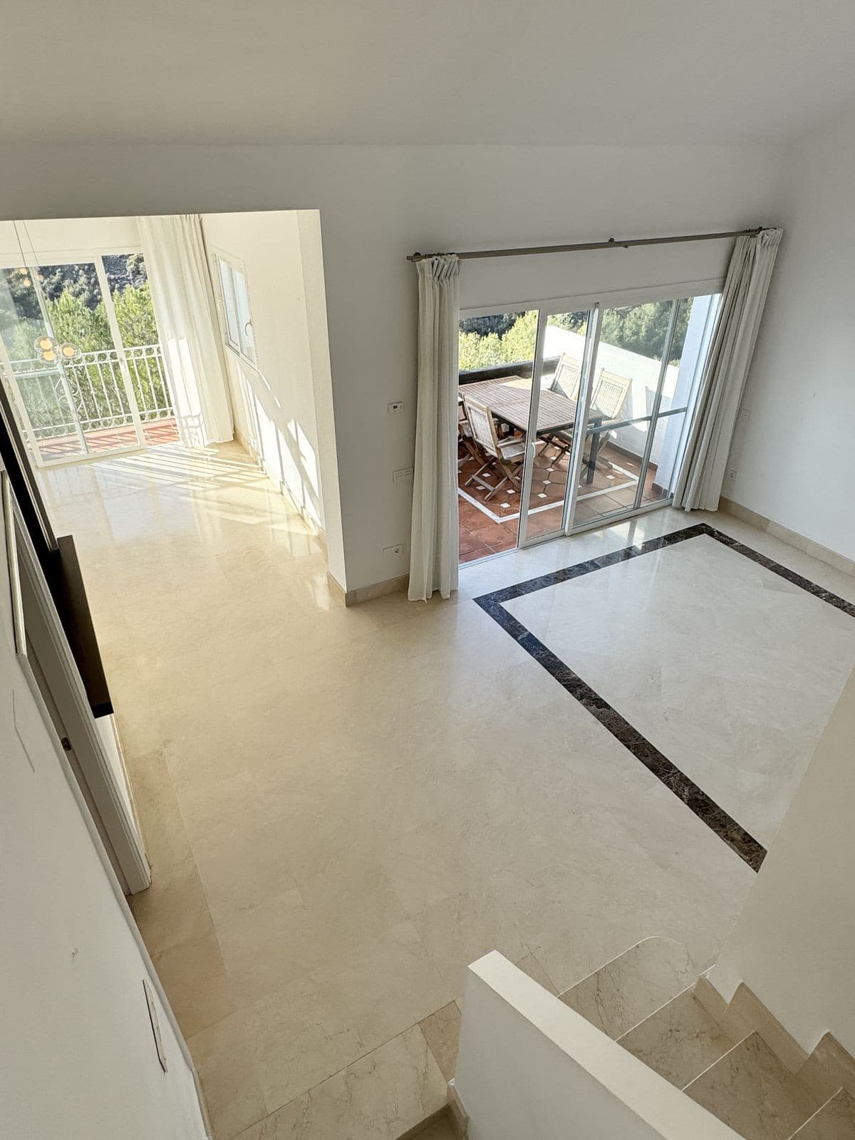 There is a terrace directly off the living room with beautiful views, & a larger terrace on the ground floor.