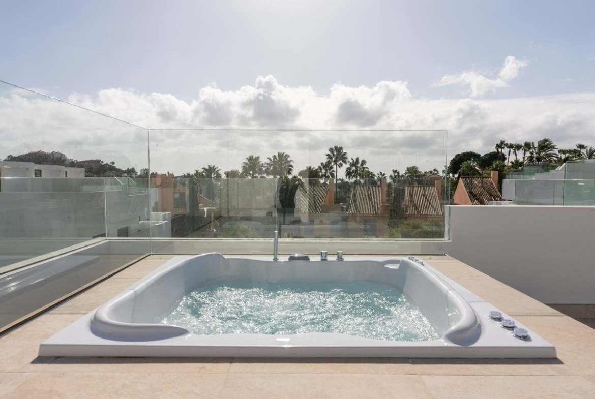 Magnificent semi-detached house with 3 bedrooms and 3 bathrooms, large kitchen, living room with access to an outside porch, terrace with a lot of privacy and Jacuzzi, private parking, community pool and gardens.