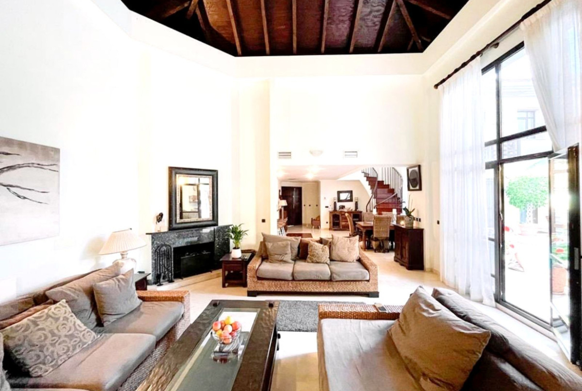 ✨ Spacious lounge with vaulted beamed ceilings and French doors opening to the terrace and pool