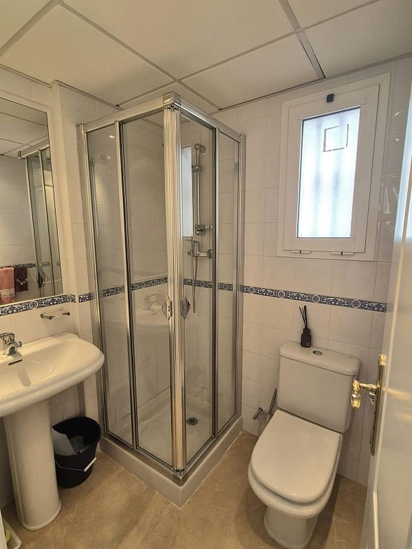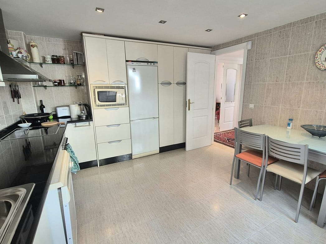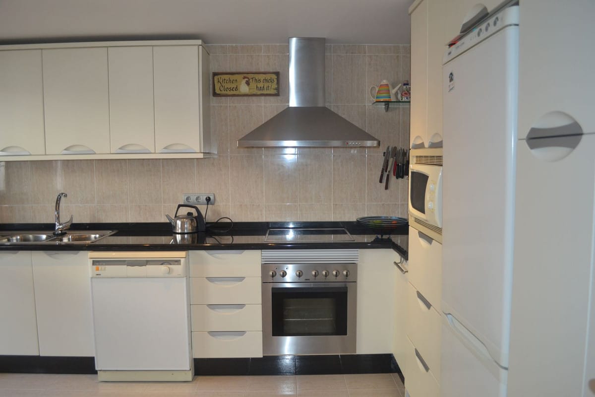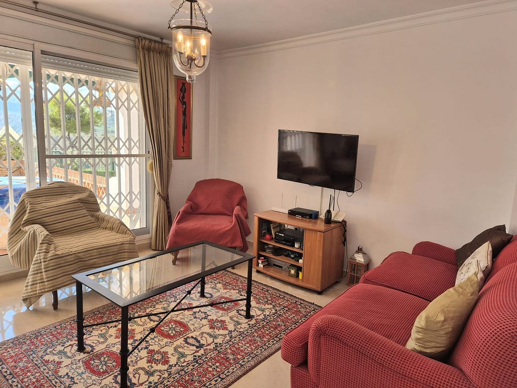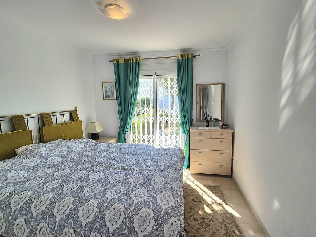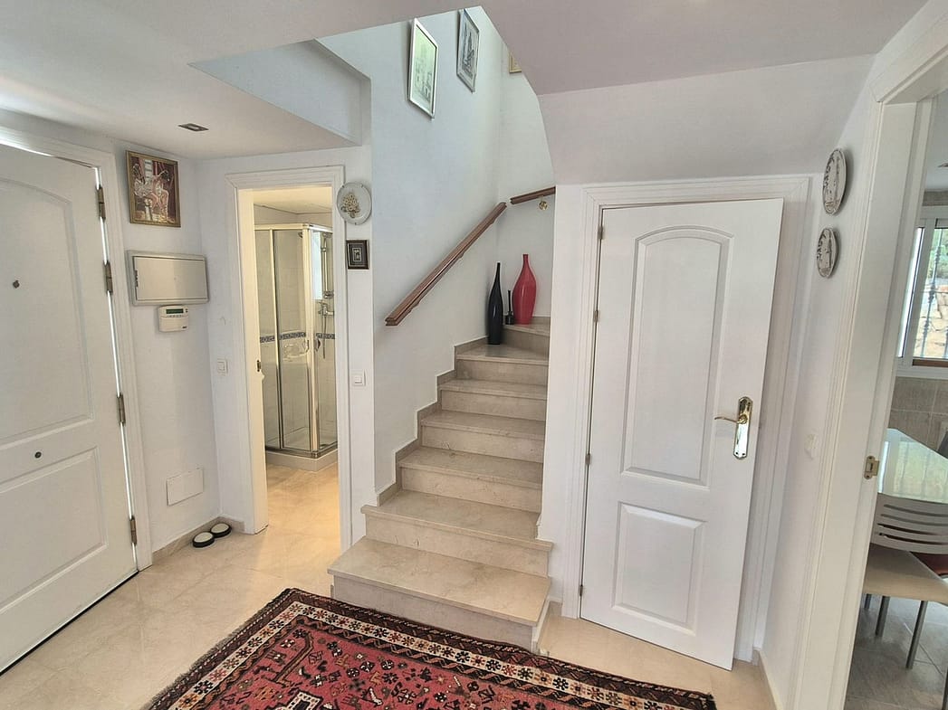 You enter the property via the private front gate, where you have your own parking space. You go up a few stairs to the main level where the property and terraces are. You have a large front terrace that is easy maintenance with flowerbeds that have automatic irrigation in place, a covered terrace with nice seating area and amazing views of the golf course, mountains and the sunset. The property is set over two floors, as you enter to the left you have a full bathroom, stairs that go up to the 2nd level and a under the stairs storage room. In front of you is a large fully equipped kitchen with a door that accesses the back terrace. From the hallway to the right you have the large living / dining room with air conditioning and two patio sliding doors that lead out to the front of the terrace. Upstairs straight in front of you, is the master bedroom with fitted wardrobes, private terrace and en suite full bathroom. To the left of the hallway you have the other 2 double bedrooms with fitted wardrobes and a bathroom to share. The house has 2 split centralizad air conditioning.