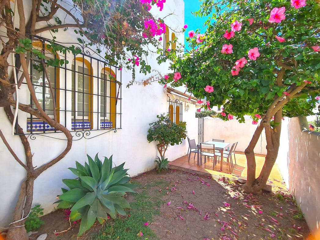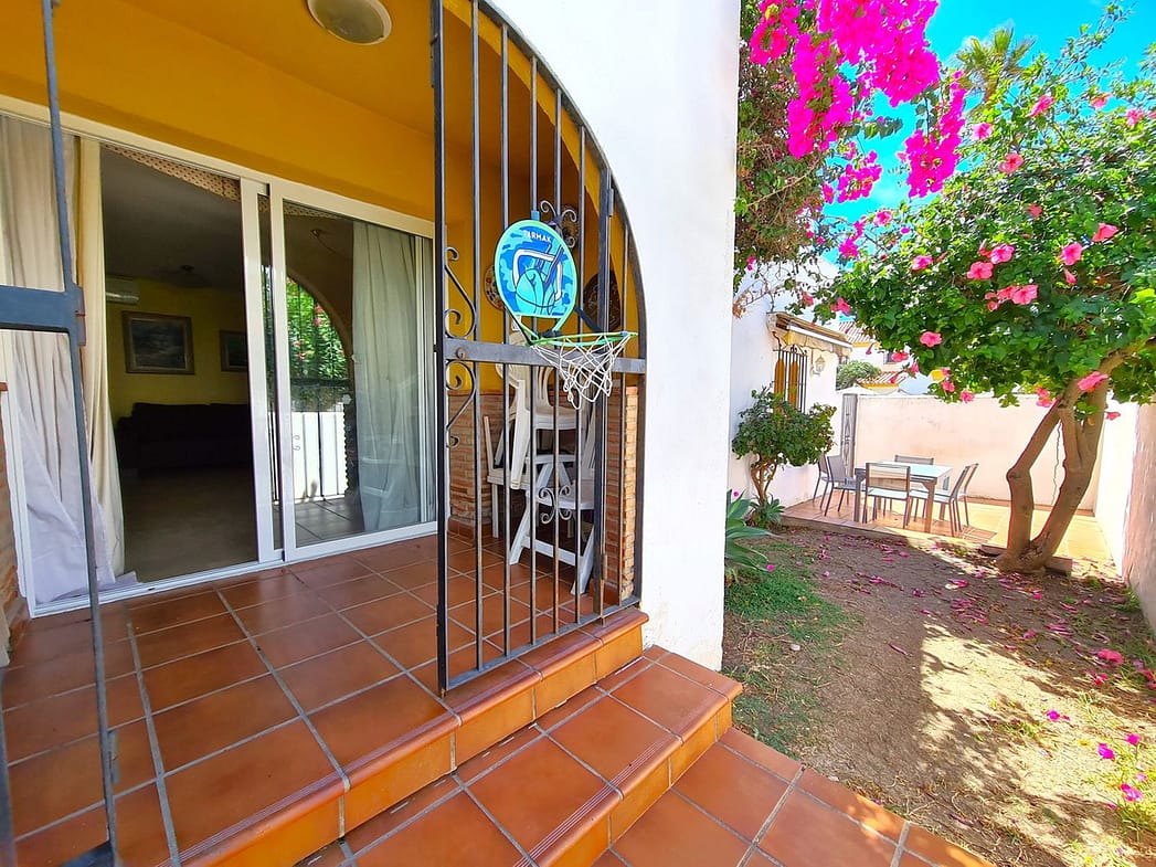 Excellently located in a beachfront development with access to the Coastal Path that connects the entire Costa del Sol, and the beach is just steps away. Close to supermarkets, shops, restaurants, and a wide variety of leisure options, Sabinillas is just a 2-minute drive away and Estepona is 10 minutes away, while Malaga Airport is a 90-minute drive away. The property is spread over two floors plus the solarium. On the ground floor, we find the main entrance with a spacious hall, a toilet with a window, a large kitchen with access to the rear terrace, and a large living-dining room with a fireplace and access to a porch that connects to the large private garden. The first floor houses the house's three bedrooms, each with its own private terrace and built-in wardrobes. It also has a spacious full bathroom equipped with a bathtub and a large window. The master bedroom has an en-suite bathroom equipped with a bathtub and a large window, as well as a beautiful private covered terrace. On the upper floor, we have a turret, a storage room, and a large solarium with views of the sea, gardens, and the pool. This well-maintained complex offers swimming pools, gardens, and beach access. A GREAT OPPORTUNITY TO EXPERIENCE THE LUXURY OF HAVING YOUR OWN HOME JUST STEPS FROM THE SEA!