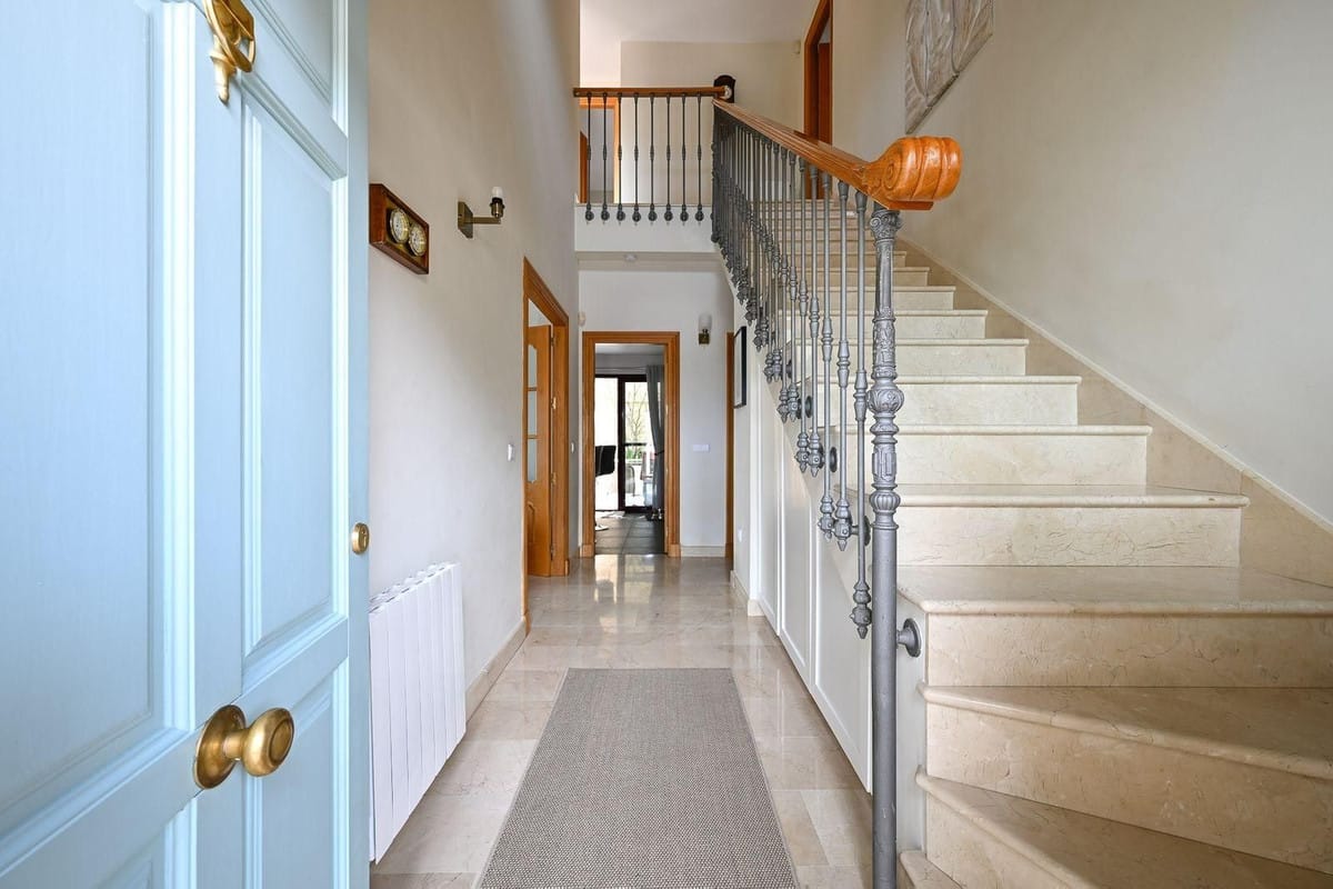 From the front garden, you enter the property and immediately have access to the main garden and swimming pool area on the left-hand side. Inside, you are welcomed by a bright and spacious entrance hall with high ceilings.