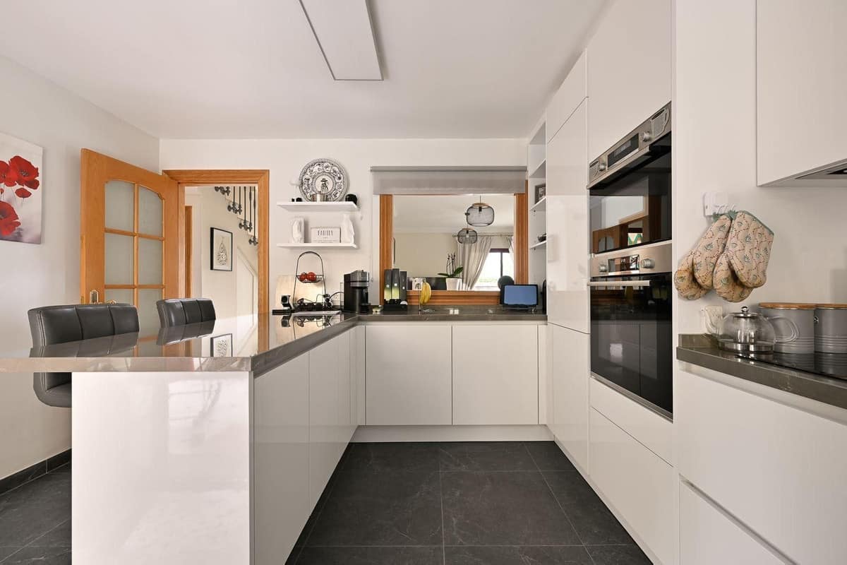 On the ground floor, to the left, there is a large and comfortable living room with sliding doors opening directly onto the garden and pool area. From the living room there is a window looking into the modern, fully equipped kitchen, which features a breakfast bar and direct access to the garden and terrace.