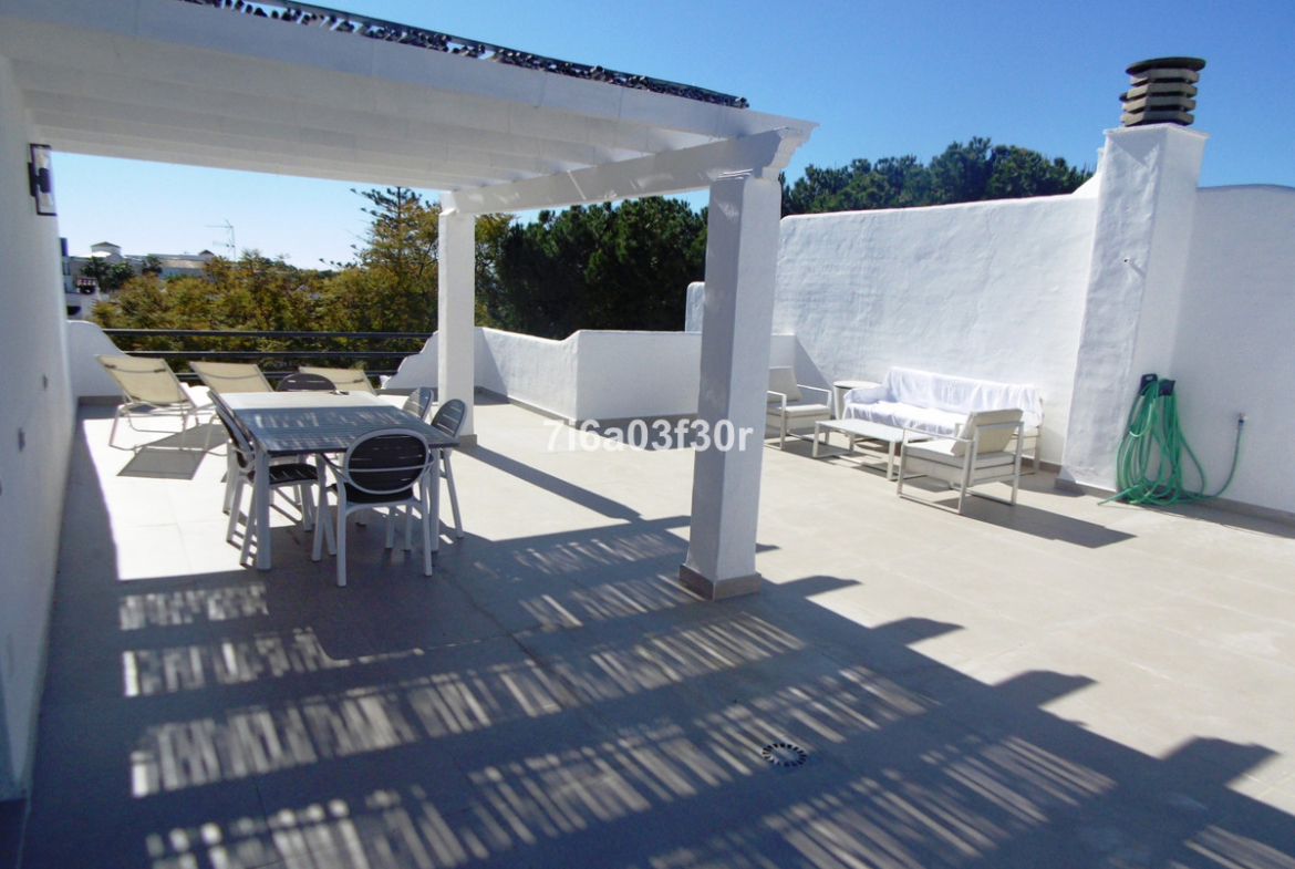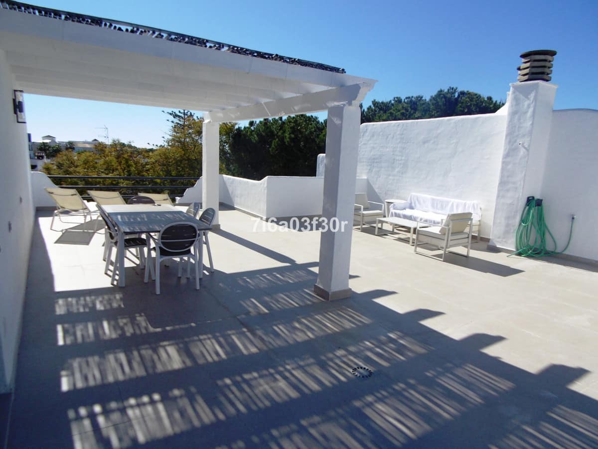 The apartment contains an entrance hall leading to the open living/dining room, fully fitted and equipped kitchen with a separate laundry room. 3 bedrooms and 2 bathroom. From the living room you have direct access to the open terrace with views to the well maintained communal garden and the swimming pool. Upstairs there is another large sun drenched roof terrace belonging to this apartment ( 85 m2)