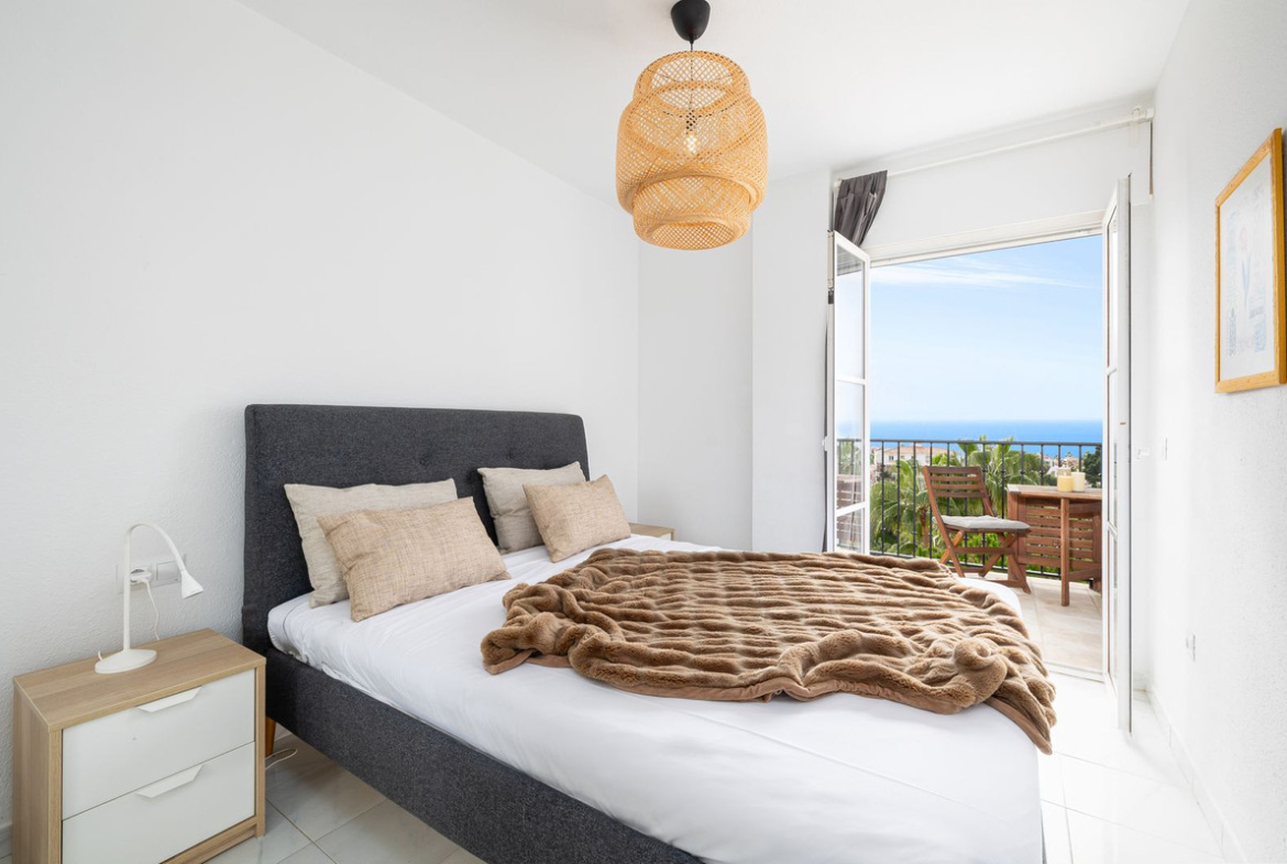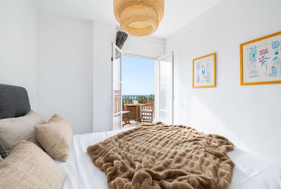 The 100-square-meter apartment includes three bedrooms and two updated bathrooms. Both the master and a secondary bedroom open onto a private terrace, separate from the main terrace off the living room. All bedrooms offer sea views, making the most of the location.