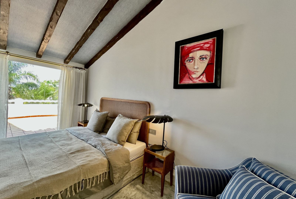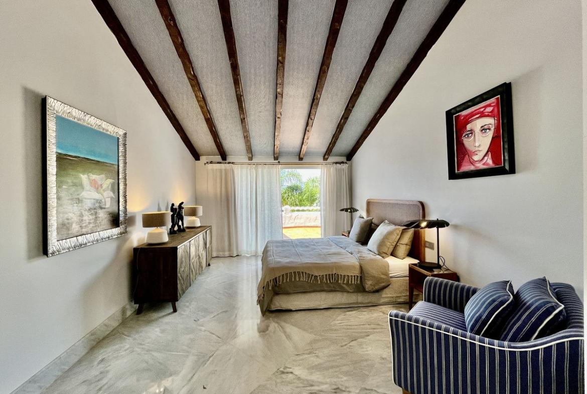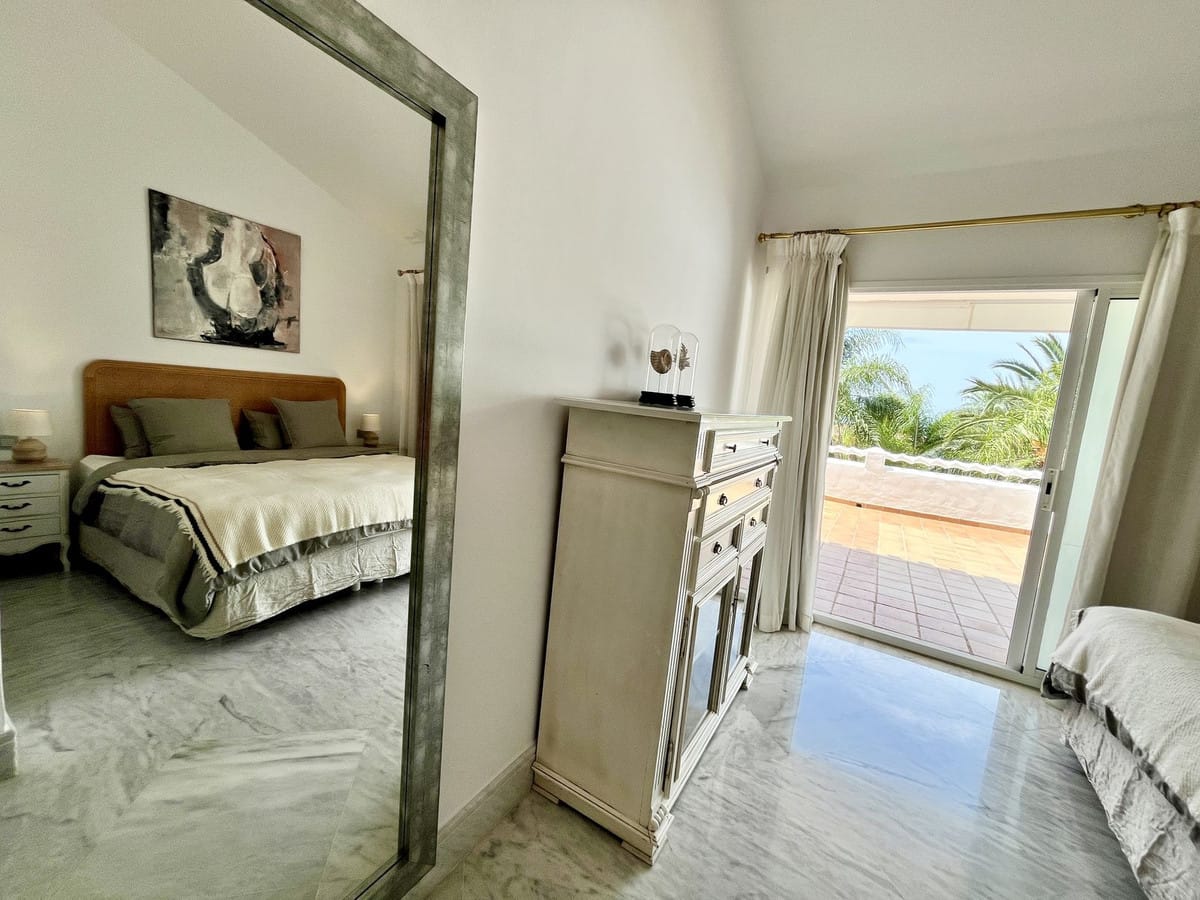 Upstairs, are the remaining two bedrooms, each with their own bathroom. Additionally, there is a large terrace upstairs, with marvellous views over the sea, the community gardens and the pool. The house is surrounded by a lot of greenery, making your stay very peaceful and calm. Furthermore, the urbanisation is very safe, as the entrance is gated by a concierge 24 hours a day.