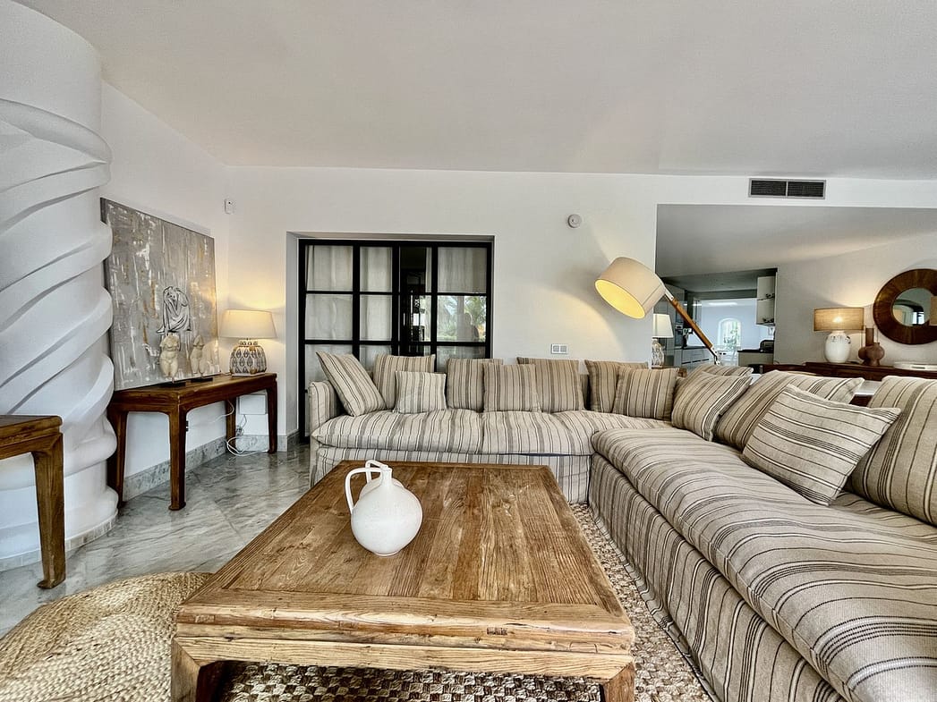 The ground floor has a very open layout. You'll find everything you need in the fully equipped and modern kitchen. Its vast size allows you to comfortably cook meals for big groups of friends and the whole family, which can be enjoyed on the beautiful terrace in the garden with a direct entrance to the community pool. You enter the the garden through the fashionably furnished living room with a dining area.